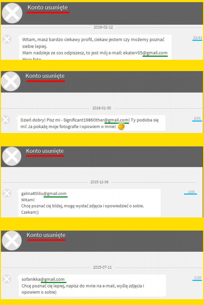 podkreślone na czerwono - WSZYSTKIE wiadomości wysłano do mnie z kont, które zostały chwilę potem USUNIĘTE.