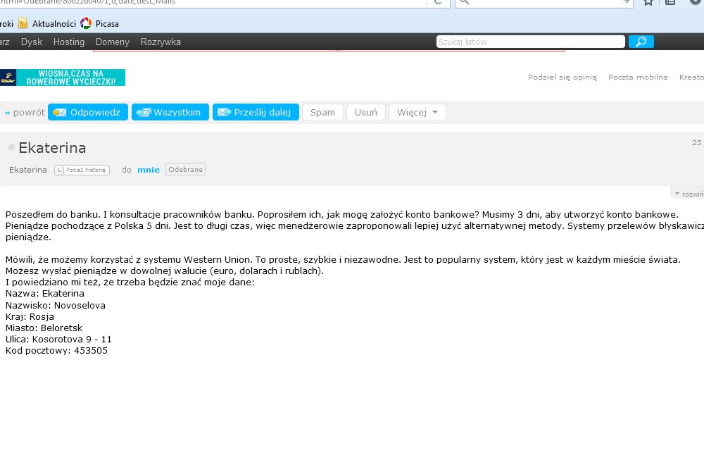 Tutaj skan z wiadomości od Ekateriny, gdzie prosi mnie o kasę i podaje adres: