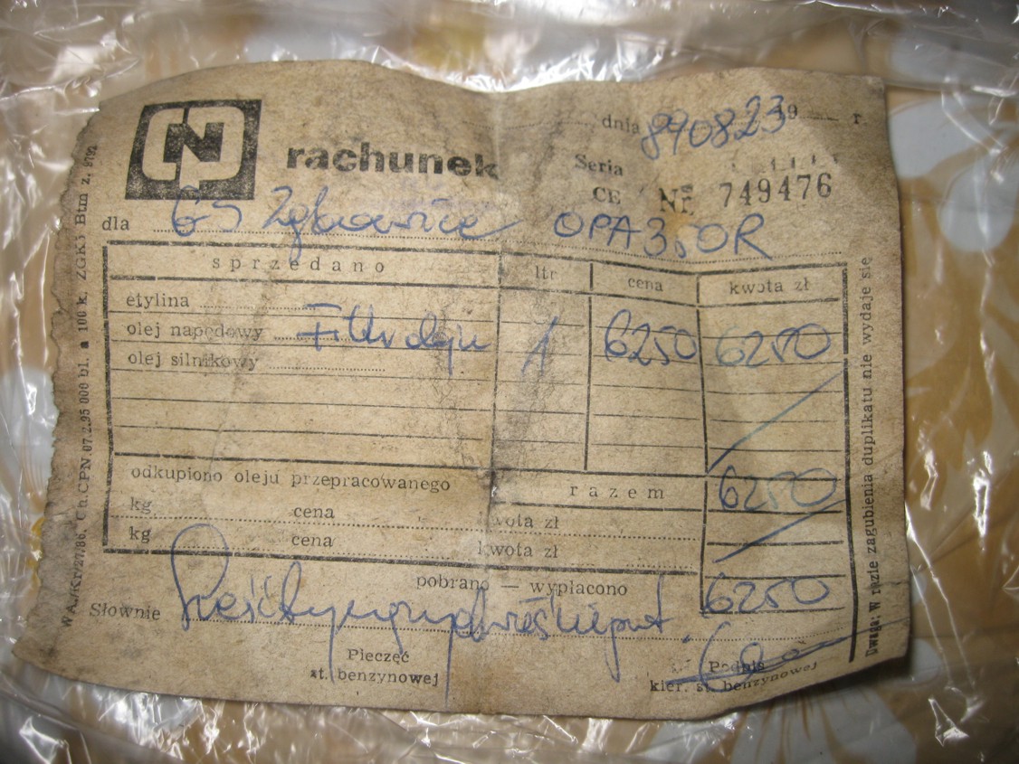 Czy był on kiedykolwiek w Szwecji, raczej się nie dowiemy, ale dowiedziałem się za to, jakie numery rejestracyjne miał on w 1989 roku i gdzie wówczas służył. W zakamarku deski rozdzielczej tkwiła brudna i zmięta kartka papieru, która po rozwinięciu okazała się być rachunkiem wystawionym 23 sierpnia 1989 roku na GS Zębowice (woj opolskie) oraz podanym ówczesnym numerem rejestracyjnym pojazdu: OPA 350R.