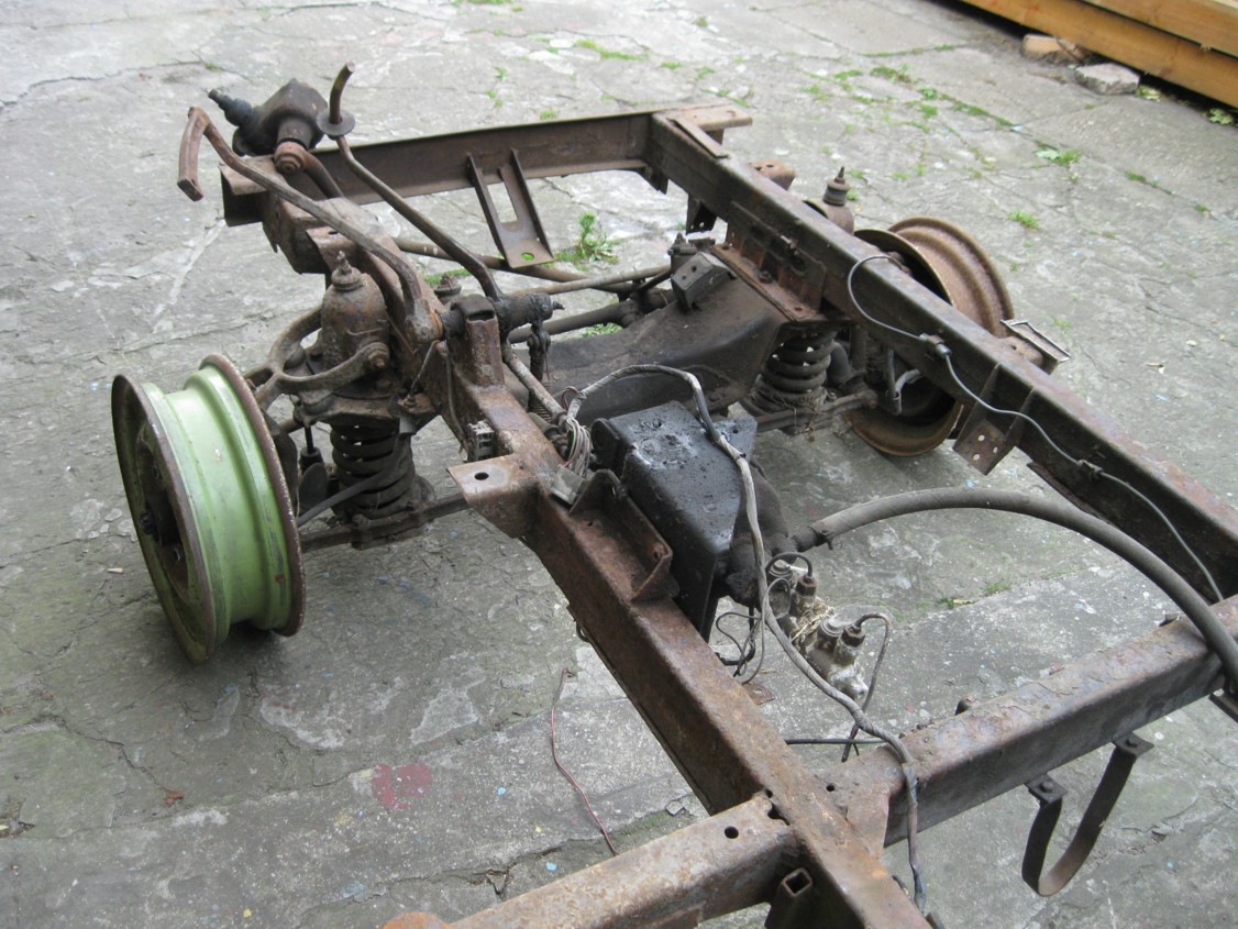 Wpadłem więc na pomysł, aby niczego z mechaniki nie przerabiać w tym podwoziu, jeśli nie będzie to całkowicie konieczne. Z tego, co widzę na chwilę obecną, konieczne będzie zamienienie rury wydechowej ze zbiornikiem paliwa miejscami. Przeróbek pedałów oraz układu kierowniczego wolał bym jednak uniknąć. Podobnie jak przerabiania mocowań ramy do nadwozia. Wolał bym zrobić coś przypominającego kształtem płytę podłogową Żuka (na odcinku od przodu komory silnikowej do miejsca za pierwszym rzędem siedzeń). Nawet chętnie wstawię te "podesty" wraz z całymi przednimi fotelami z Żuka, które wymontowałem we wtorek z tej szoferki...