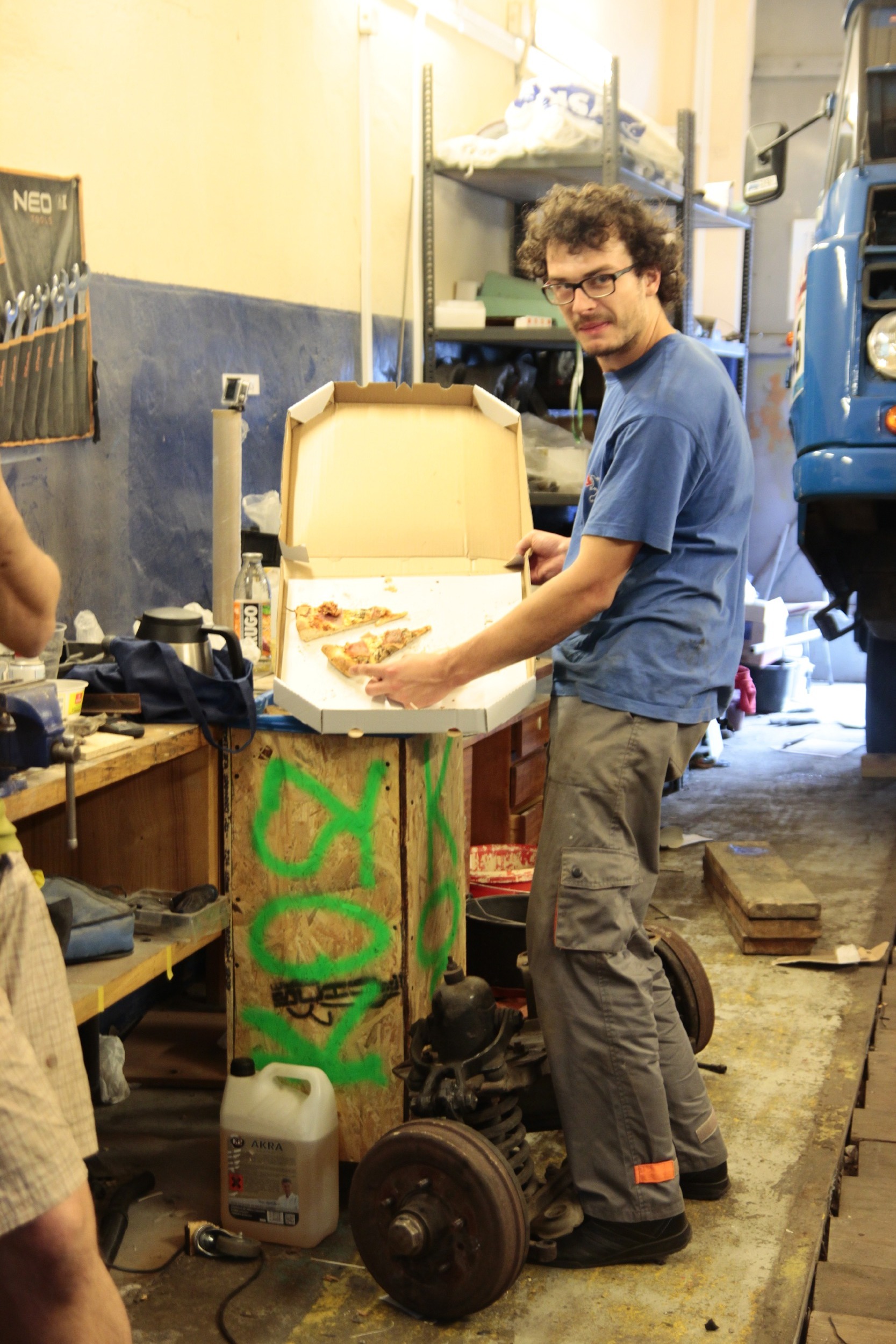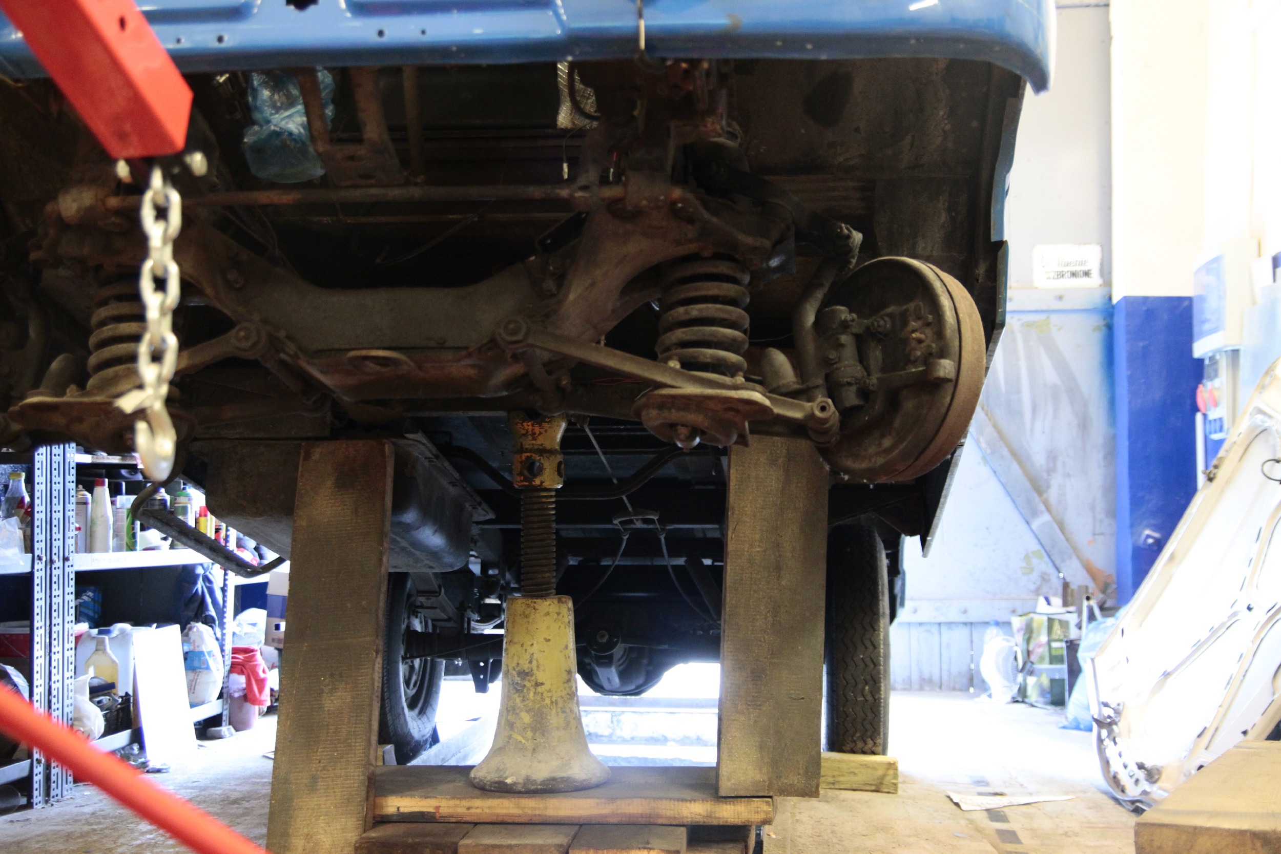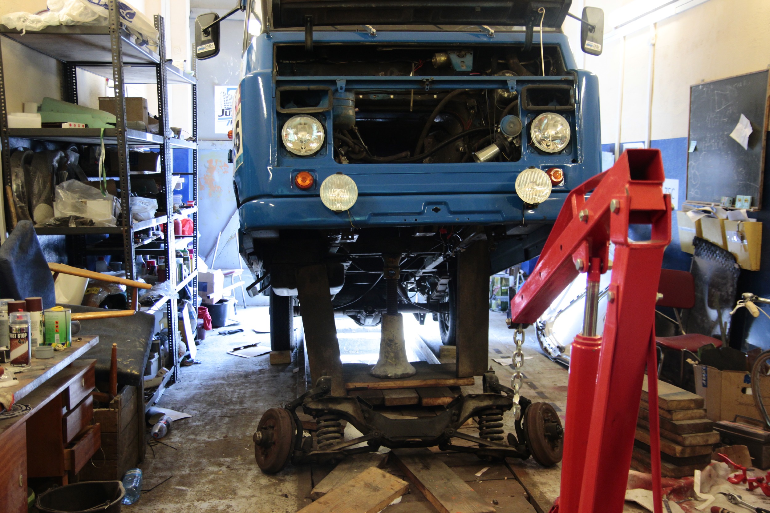 Procedura wyglądała tak, że podnośnikiem do silników podnieśliśmy przód budy(z ramą) na wysokość ok 1,20 m. Podparliśmy budę za ramę wielkim budowlanym filarem - naprawdę stabilny, te "prowizoryczne" deski po bokach są faktycznie prowizoryczne, miały zabezpieczać przed przewróceniem konstrukcję, która była w zasadzie nieprzewracalna. Ale kierując się zasadą "strzeżonego pan Bóg strzeże..." daliśmy te deski :D