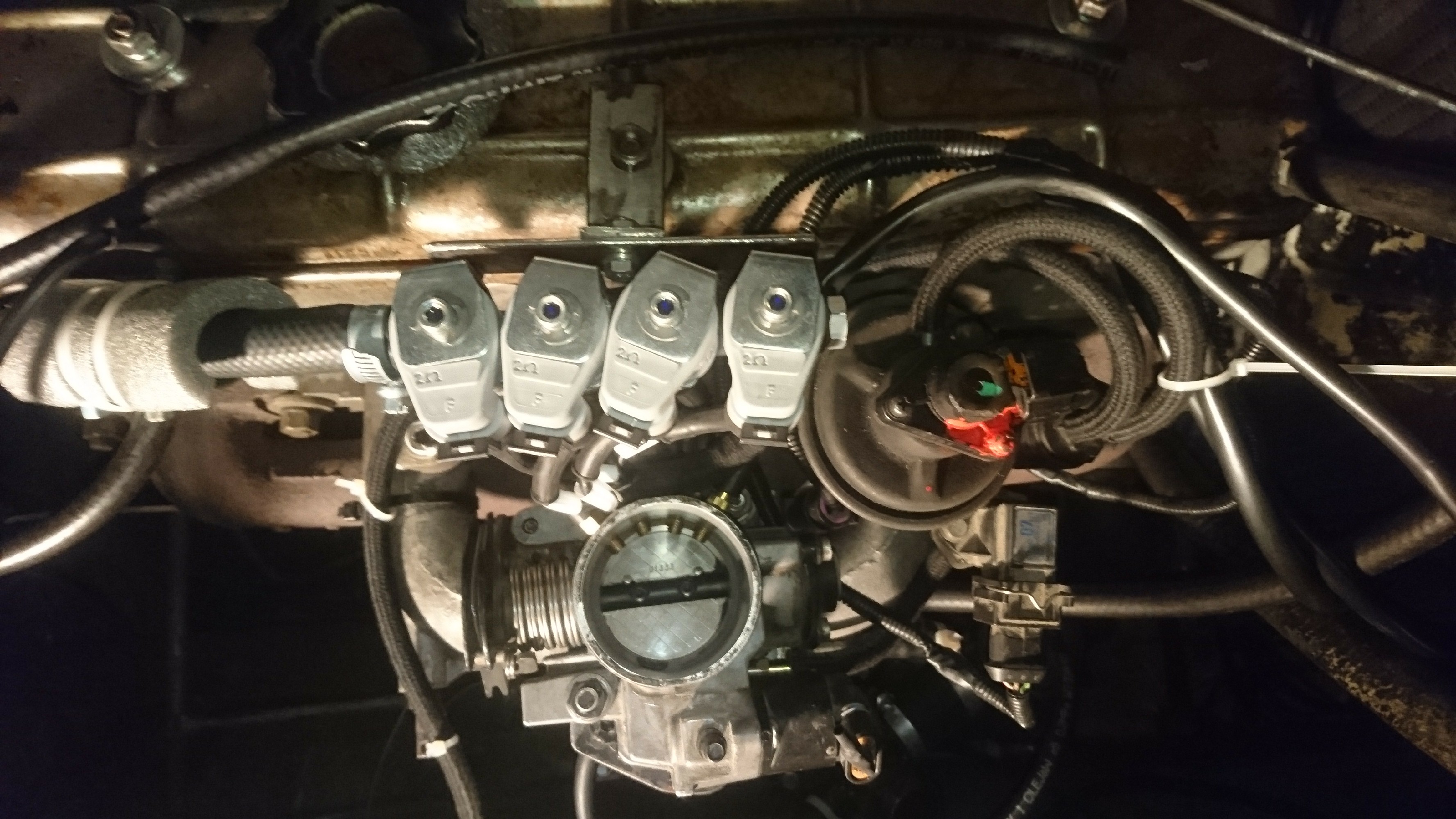 Jeśli chodzi o wtrysk gazu to jest nad przepustnicą dla tego że musiałem go dać we wspólnym miejscu. Gdybym dał po dwa wtryski na kanał musiałbym pilnować czasów otwarcia zaworów z racji że tu mamy dwa suwy ssania po sobie. Do tego potrzebne są dodatkowe czujnik położenia wału/wałka oraz co ważniejsze dodatkowy kod w sterowniku. Teraz zamiast czujnika położenia używam uzwojenia pierwotnego cewki. Nie synchronizuje się z pierwszym cylindrem bo nie muszę. Gdyby każdy cylinder miał oddzielną nogę kolektora to dodałbym pełną sekwencję. W tym silniku nawet małe opóźnienie w podaniu gazu mogłoby spowodować nierówną pracę. (Tak mi się wydaje, mogę nie mieć racji ale raczej mam)