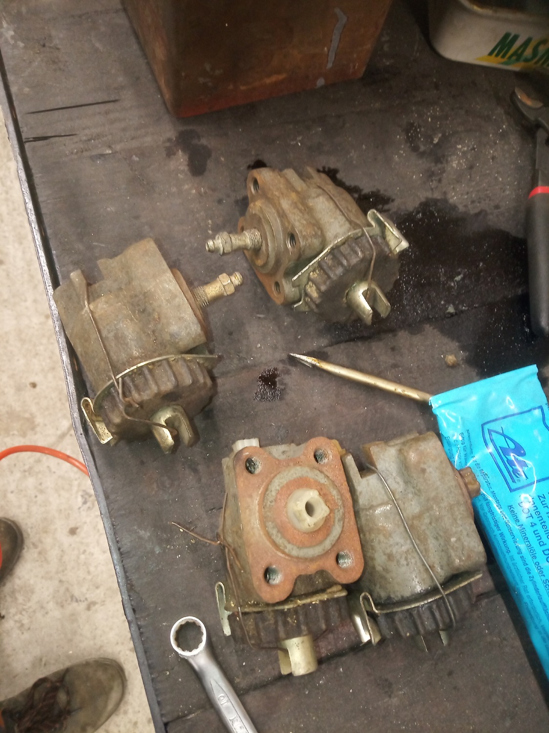 Po spłukaniu z niego mchu, odkurzeniu futra z foteli, wywaleniu zgniłych i omszałych pozostałości po płycie na pace uruchomiłem w nim kompletną elektrykę za wyjątkiem: jednej dmuchawy, którą musze wymienić, wskaźnika paliwa (pływak rozwalony), wskaźnik temperatury wody i ciśnienia też głupoty pokazują. Czas i na to przyjdzie. Następnie zabrałem się za czyszczenie zbiornika paliwa, bo mimo, że nowy to syf na dnie zapychał przepływ. Przeczyściłem, zalałem świeżym paliwem, zmontowałem, wyczyściłem aparat zapłonowy, wyczyściłem kanał przyspieszacza w gaźniku, podregulowałem lekko i jedzie jak zły. Hamulce zostały przejrzane, cylinderki wymieniłem na "nowe" leżaki magazynowe, zastane tak, że trudno było tłoczki wyjąć nawet przy użyciu kompresora. Wszystko złożone na nowo na pastę Ate, myślę, że posłuży, potestuję jak bardzo złe są te cylinderki z regulacją. Na razie muszę zmienić szczęki, bo te zalane były płynem z poprzednich cylinderków, ale na ten moment staje dęba, hamuje super, ale też na pusto on lekki, kołami mieli, aż trudno ruszyć na żwirze