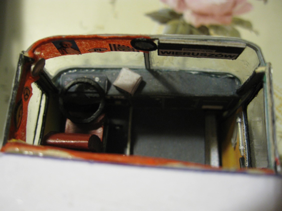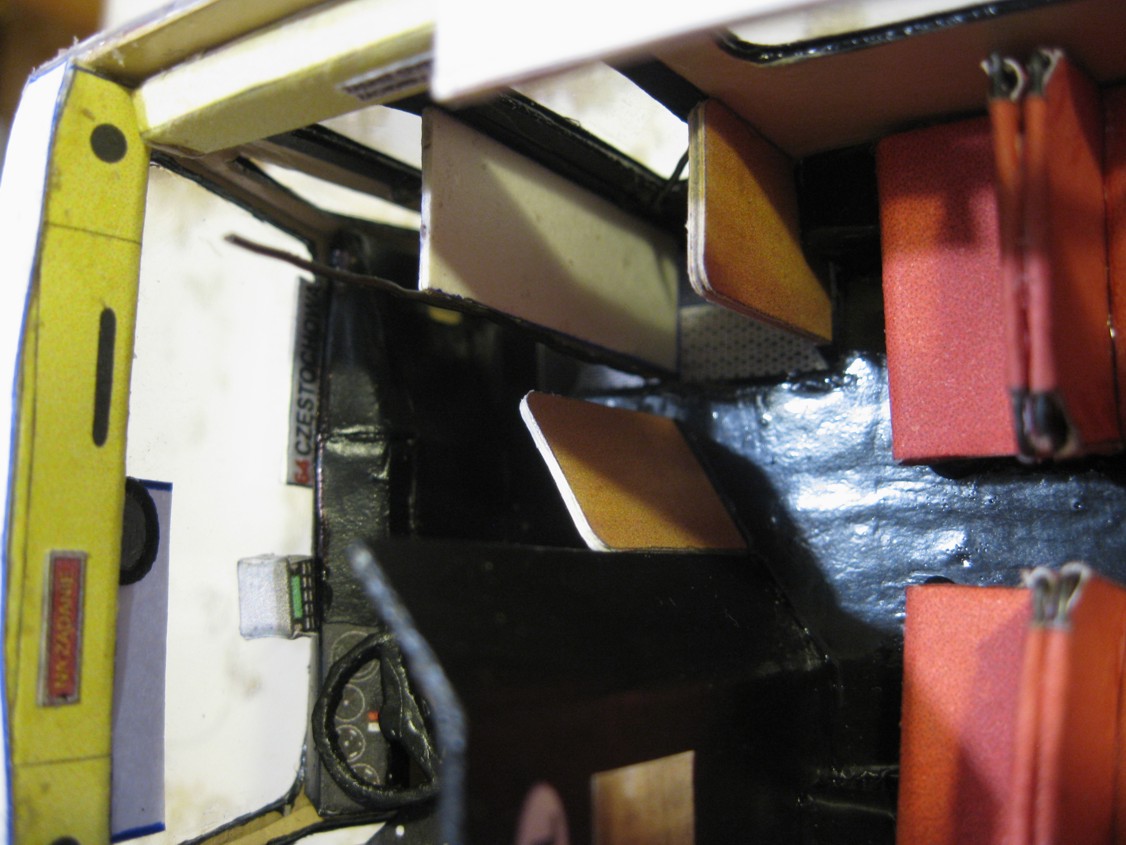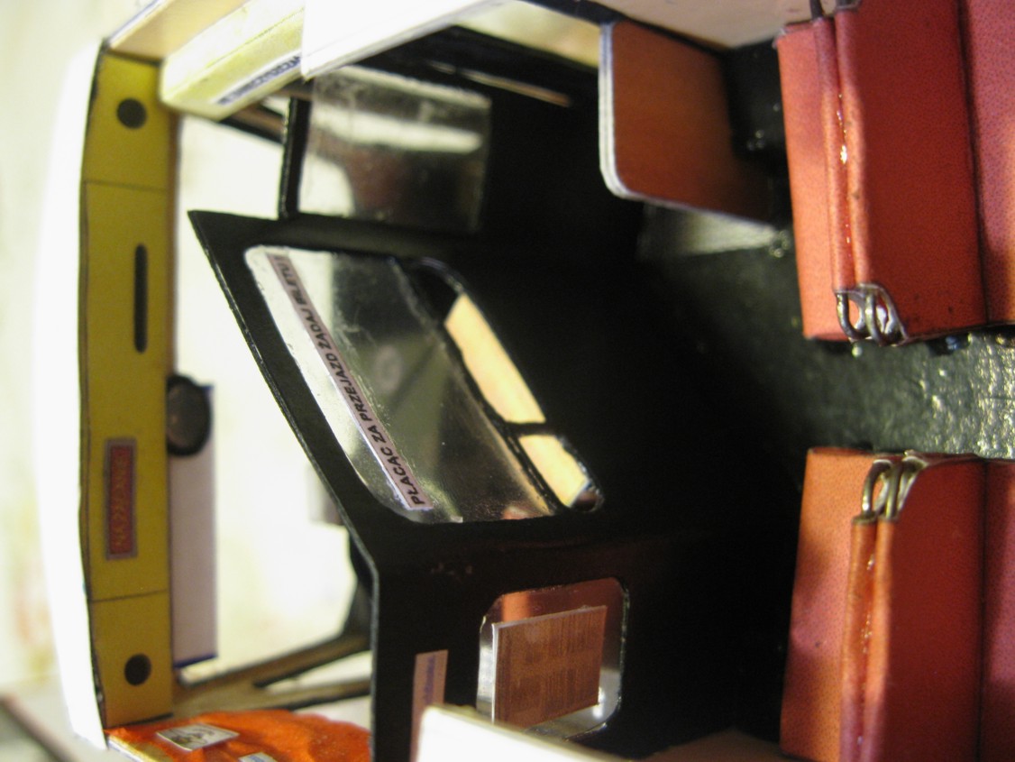 Więc od początku. Miałem jako bazę model kartonowego autobusu bez wnętrza. Całe szczęście, że szkielet tego modelu ma konstrukcję podobną do prawdziwego Jelcza... Trzeba było wyciąć okna, nieznacznie przerobić płytę podłogową, dodać progi i stopnie, a powierzchnię kartonu od środka pomalować farbą akrylową "krem orzechowy", która imituje laminaty i dykty, którymi pokryte były ściany Jelcza...