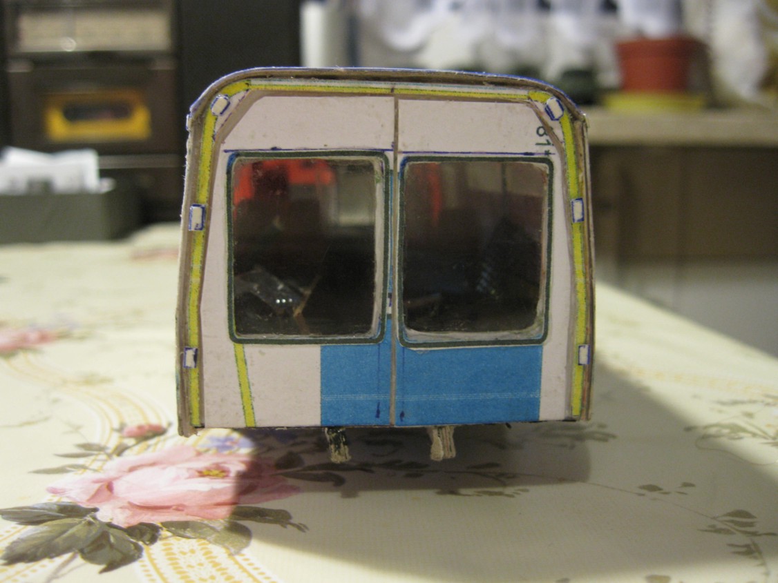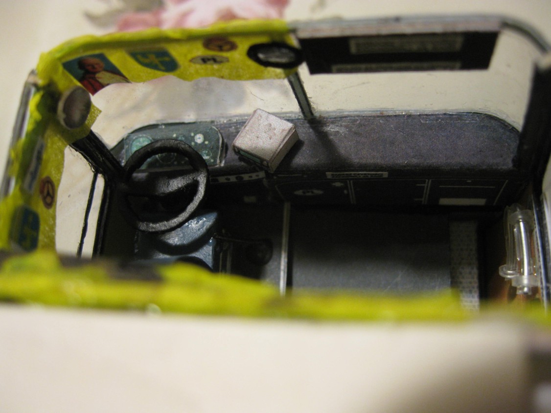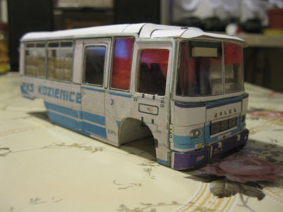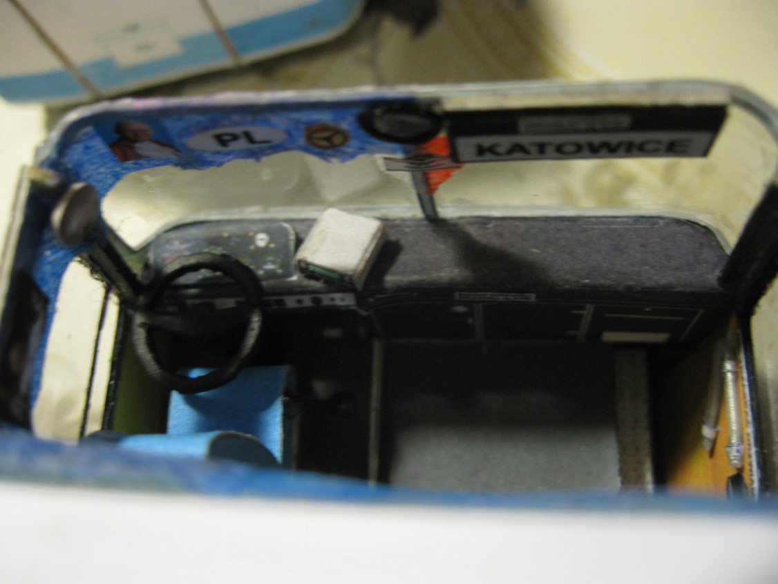 Więc od początku. Miałem jako bazę model kartonowego autobusu bez wnętrza. Całe szczęście, że szkielet tego modelu ma konstrukcję podobną do prawdziwego Jelcza... Trzeba było wyciąć okna, nieznacznie przerobić płytę podłogową, dodać progi i stopnie, a powierzchnię kartonu od środka pomalować farbą akrylową "krem orzechowy", która imituje laminaty i dykty, którymi pokryte były ściany Jelcza...