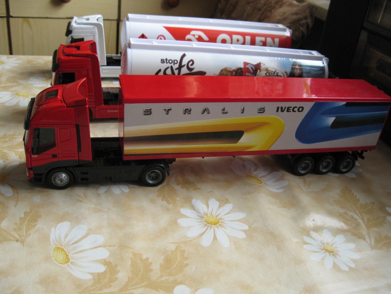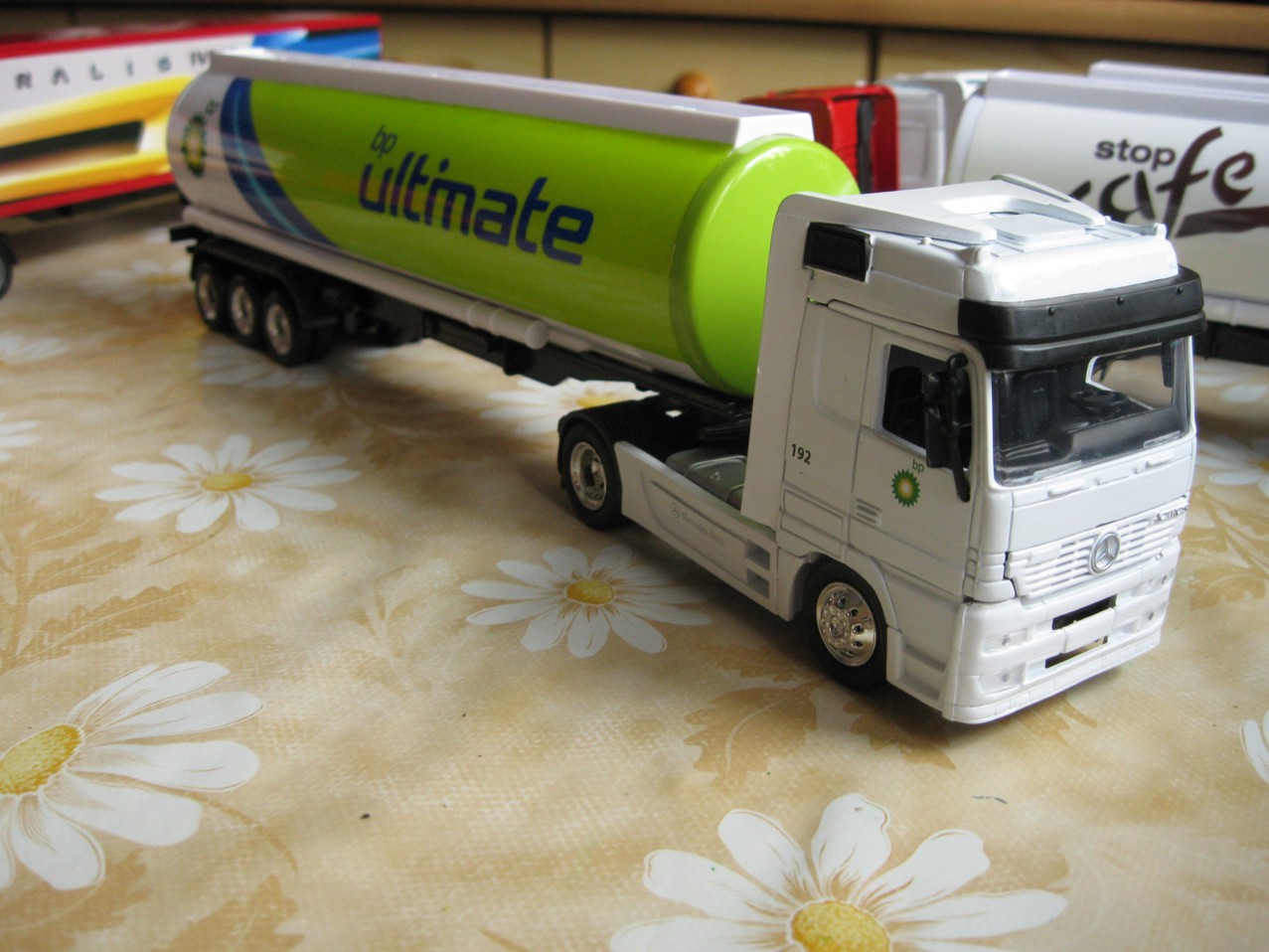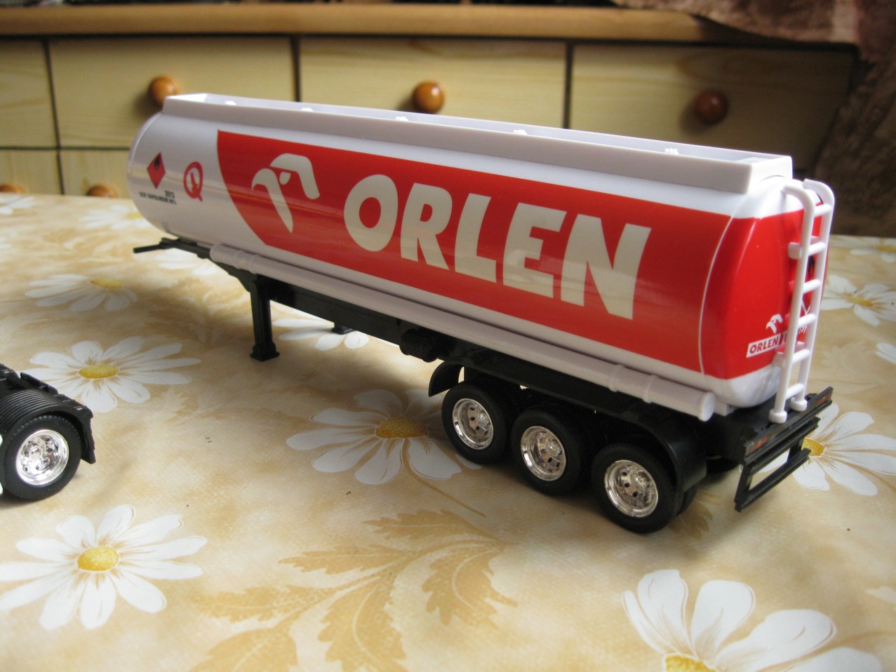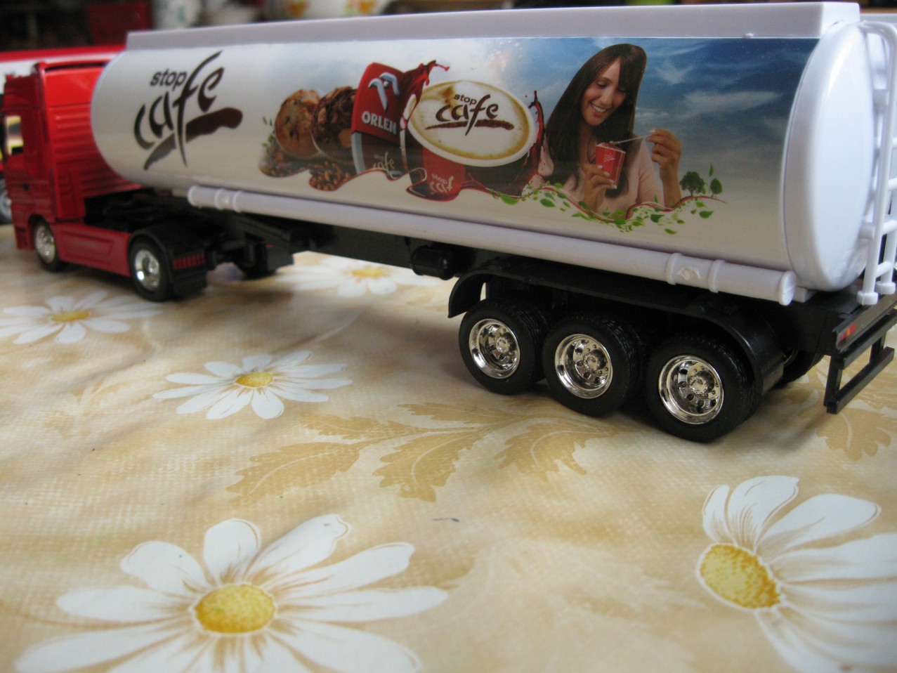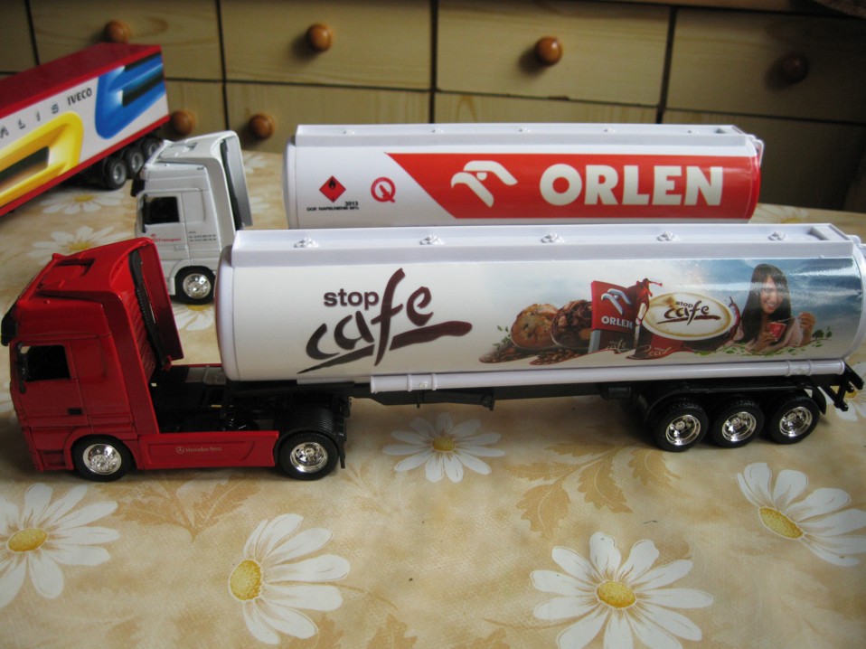 Nic nie jest fantazją projektantów modeli tych TIR-ów. No może małe zestawienie ciągników. Codziennie widuję dziesiątki TIR-ów przejeżdżających drogą krajową nr 901. Cysterny - naczepy w barwach Orlenu są identyczne. zarówno ta z samym logo, jak i ta z napisem "ORLEN CAFE" i fotką tej brunetki. Podobnie z oznakowaniami cysterny z BP. Jedyne, czego mógłbym się doczepić, to zestawienie ciągników siodłowych. U mnie widuję przede wszystkim ciągniki marki Volvo, koloru srebrnego z rejestracjami "WGM", ale nie wykluczam, że w innych rejonach Polski, koncern ORLEN nie używa takich właśnie Mercedesów Benz Actros, jak w tym modelu. Często widywałem identyczne ciągniki Mercedesa z identycznymi cysternami, ale w innych barwach, więc całkiem możliwe...