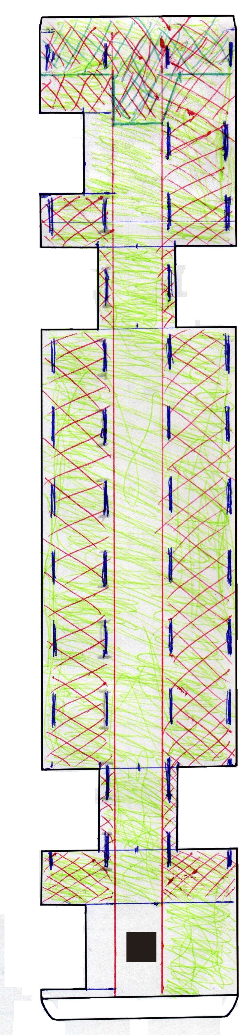 Rysunek płyty podłogowej, gdzie na podstawie zdjęć rozplanowałem całą trójwymiarową powierzchnię płyty podłogowej (każdy poziom zakreślałem innym kolorem długopisu i przymierzałem do rysunków ścian (by zgadzały się np rozstawy nadkoli, drzwi, itd) Rysunek zeskanowałem i na jego podstawie robiłem całą grafikę komputerowo :wink: