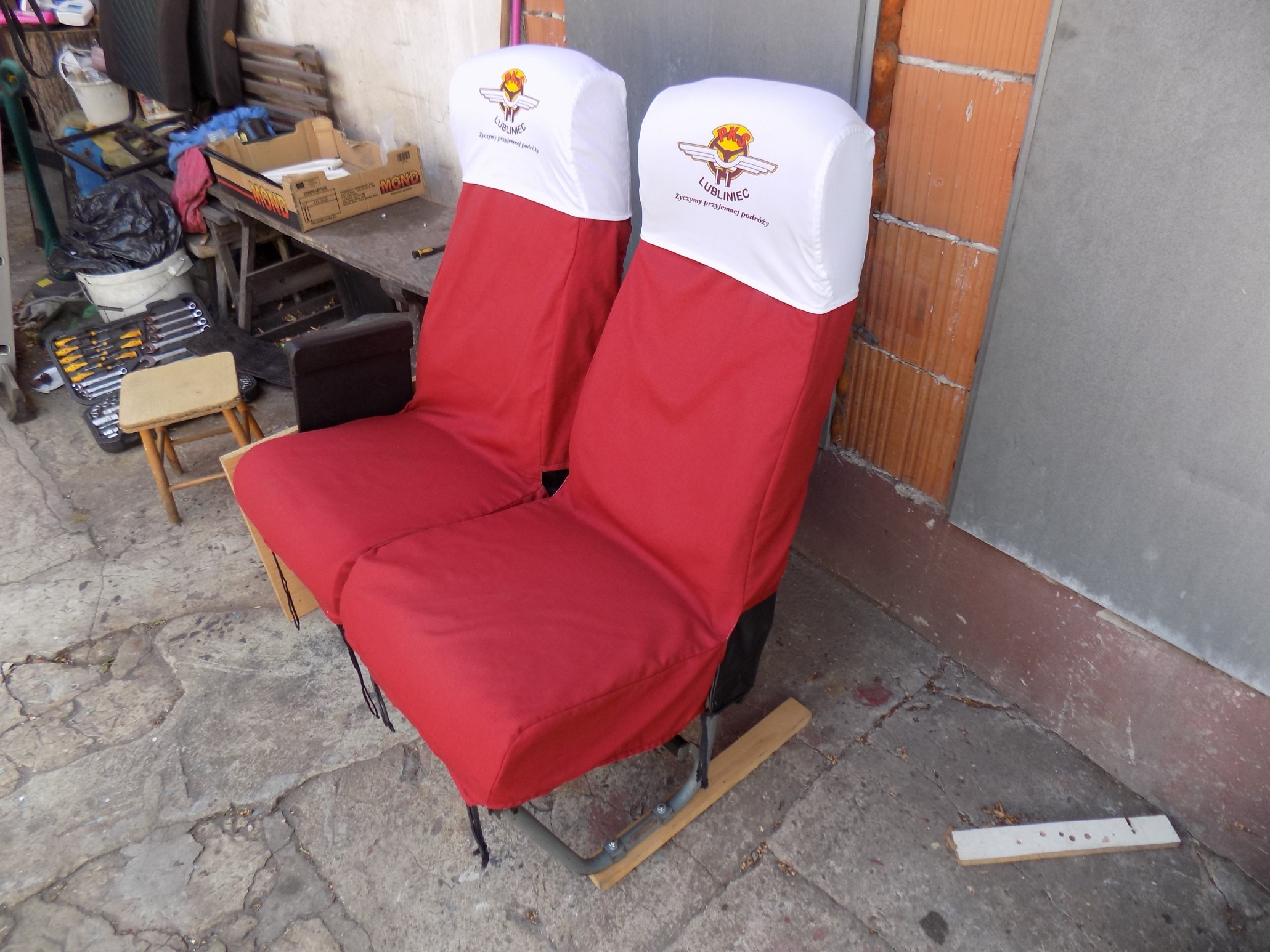 We flocie PKS Lubliniec najczęściej widziałem (i pamiętam) pokrowce w kolorze czerwonym (takie, jak na zdjęciach mojego siedzenia), ale na magazynie znalazłem pojedynczą sztukę pokrowca w kolorze szaroniebieskim i chyba szaroczerwonym (szary z nitkami/paskami w kolorze). Przygotowałem też siedzenia w barwach innych PKS-ów: Opolskie PKS, Zielona Góra i Kozienice.