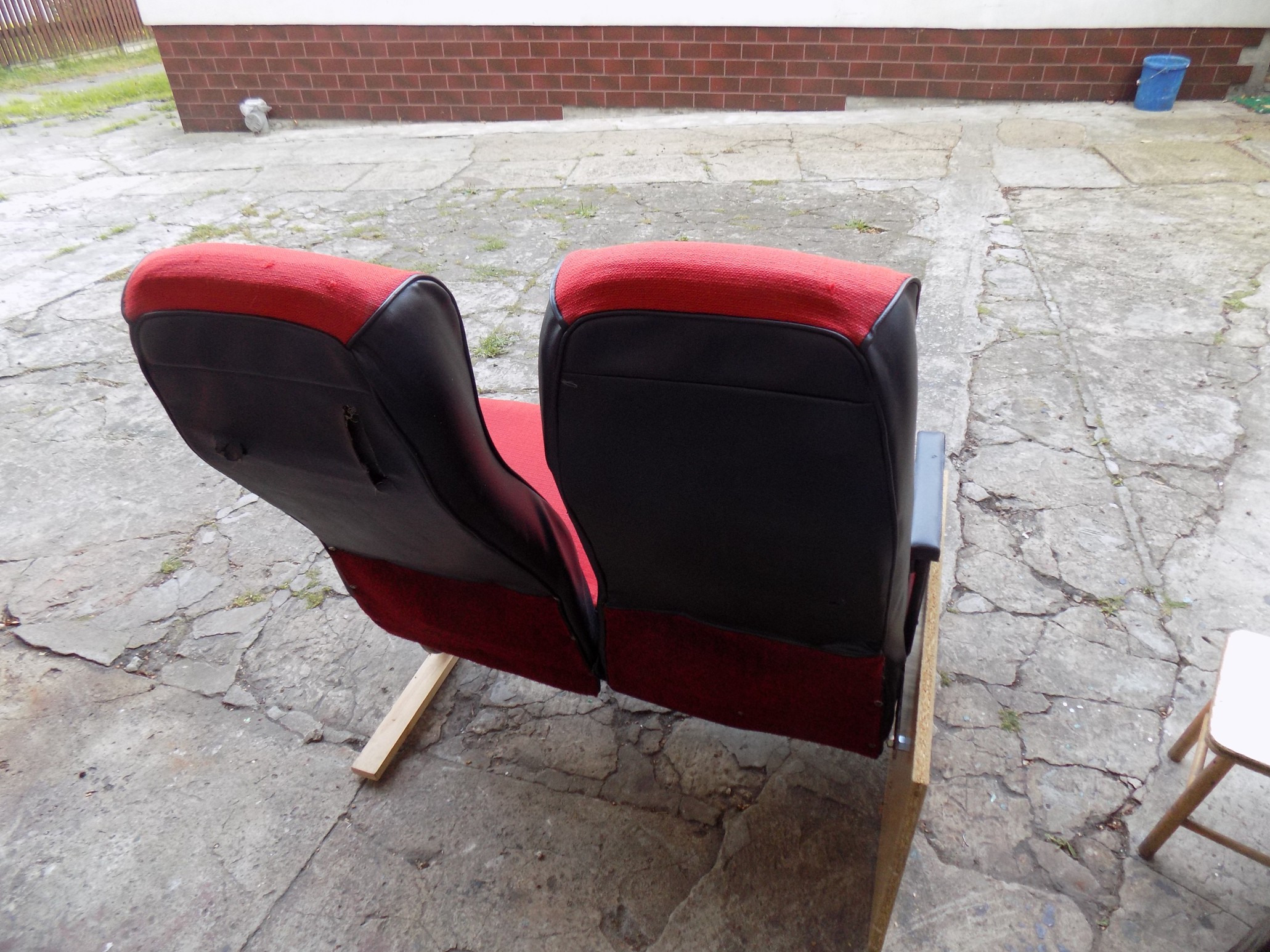 Aby fotel mógł samodzielnie stać, musiałem dokręcić kawał płyty wiórowej (bo siedzenie oryginalnie przykręca się bezpośrednio do ściany) oraz klocek - "płozę" do nóżki, aby się do tyłu nie przewrócić :wink: