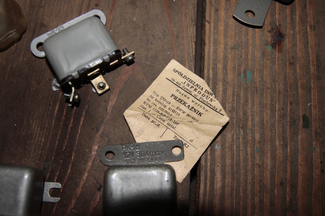 Przekaźniki starego typu do Żuka/Warszawy, na śrubki, są szare i szare młotkowe nieużywane z epoki, niektóre zafoliowane z karteczkami, 20zł/sztukę