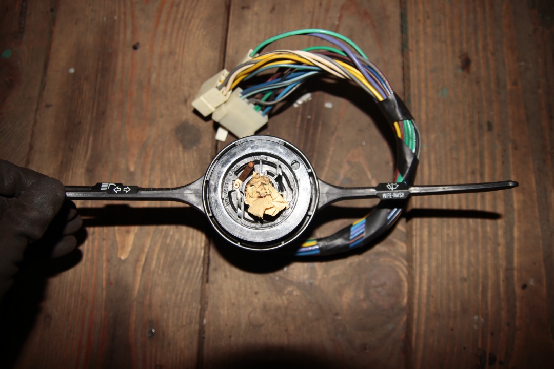 Przełącznik zespolony pod kierownicę.. chyba do dużego Fiata/Poloneza, zobaczcie sami, z wepchniętą karteczką w środek, jednak nie napisane na niej do jakiego samochodu. Żuk ani Nysa na pewno nie. Nieużywany, z epoki, jedna sztuka, 90zł