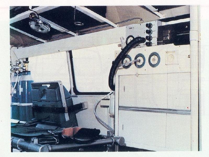 Na zdjeciu jedna z krakowskich Nys 522 "R" z poczatku lat 90-tych. Obok widocznych na zdjeciu kroplowek (lewy dolny rog) przeznaczone bylo miesce na dwie butle tlenowe (10-litrowe), dalej miesce na defibrylator (WRK) a dalej szafka na leki z wyjsciami tlenowymi i z proznia. Na szafce miejsce na walizke. Nad noszami umieszczono podluzny schowek na szyny kramera (na zdjeciu z naklejkami SONY, CAMEL).