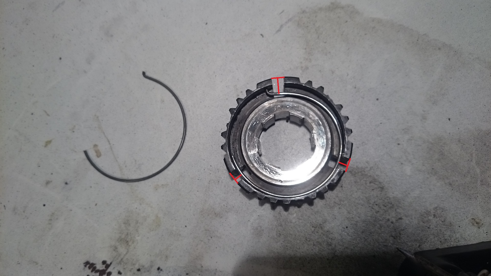 Ostatni mój problem to sprężyny montowane chyba w przesuwkach stałych (ale pewien nie jestem), które mają za zadanie podtrzymać kamienie synchronizatorów. Na zdjęciu nr 3 widać, że odległość pomiędzy drutem a synchronizatorem jest różna. Jak powinienem poprawnie zamontować te druciki-sprężyny?