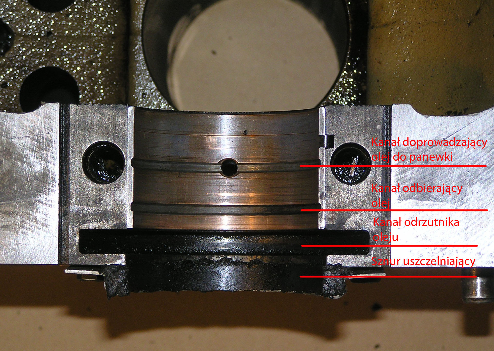 Zastanawia mnie tylko taka rzecz : do panewki olej dostaje się środkowym otworem z wału korbowego . Po wykonaniu swojej roboty wysącza się z jednej strony do skrzyni korbowej , a z drugiej do tego kanału odbierającego i przez pokrywę panewki wraca do miski . Ewentualne resztki oleju powinien zebrać odrzutnik , który też w swoim kanale ma otwory wypuszczające olej do miski . Dlaczego więc olej dochodzi i przesącza się przez ostatnie uszczelnienie jaki jest sznur ? Zastanawiam się , czy nie należy zwiększyć średnicę otworów w pokrywie panewki oraz w kanale odrzutnika ? .
