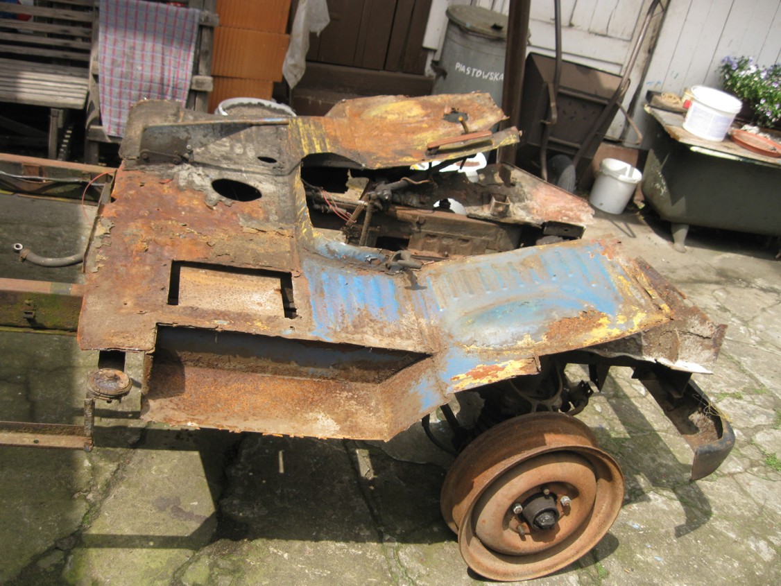 Po wycięciu płyty podłogowej, zrobiłem małą przymiarkę do ramy. Conieco z tej płyty podłogowej wykorzystam w "nysożuku", ale nie w całości - no bo sami widzicie, jakie to jest zgnite. Poza tym i tak by nie spasowało, ale pewne elementy trafią do samochodu na 1000% 8)