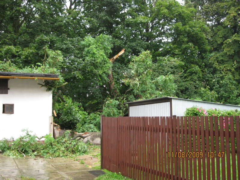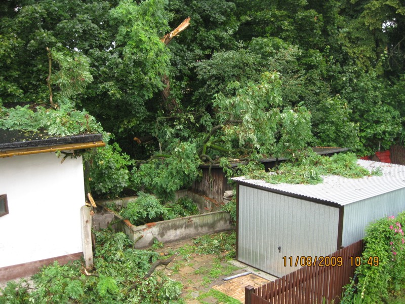 Miałem w planach prace przy garażu, gdy dzwoni do mnie telefon i dowiaduję się, przed wyjazdem z domu, że na garaż spadło drzewo. W tym samym czasie oderwała się druga część tej starej 100 letniej akacji demolując wszystko jeszcze bardziej.