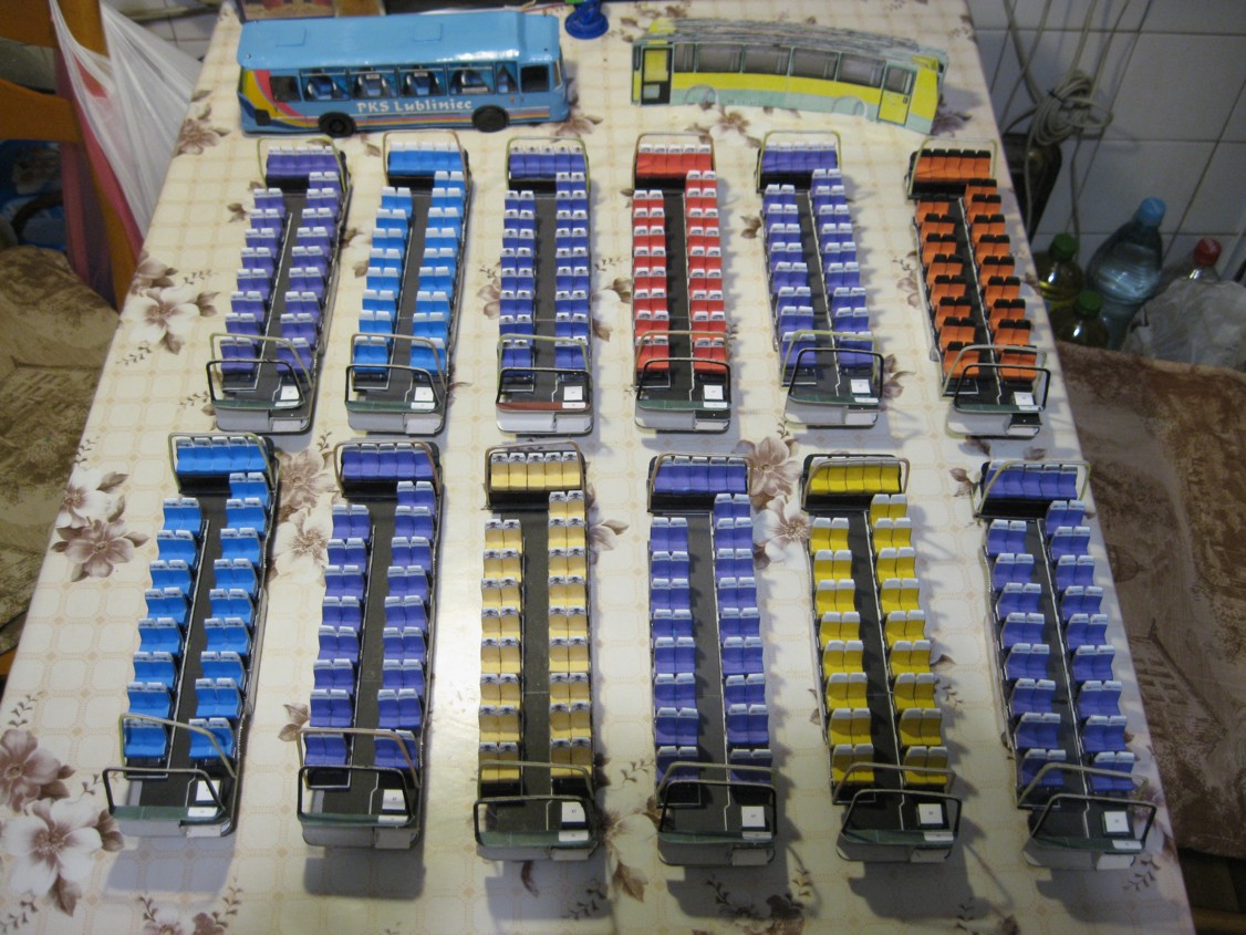 Fotele w kolorze: rudym, brązowym i szarym - to wiernie odwzorowana kolorystyka pokrowców używanych przez PKS Lubliniec od lat 80-tych. Mam oryginalne pokrowce i na podstawie ich zdjęć zrobiłem te elementy modeli.