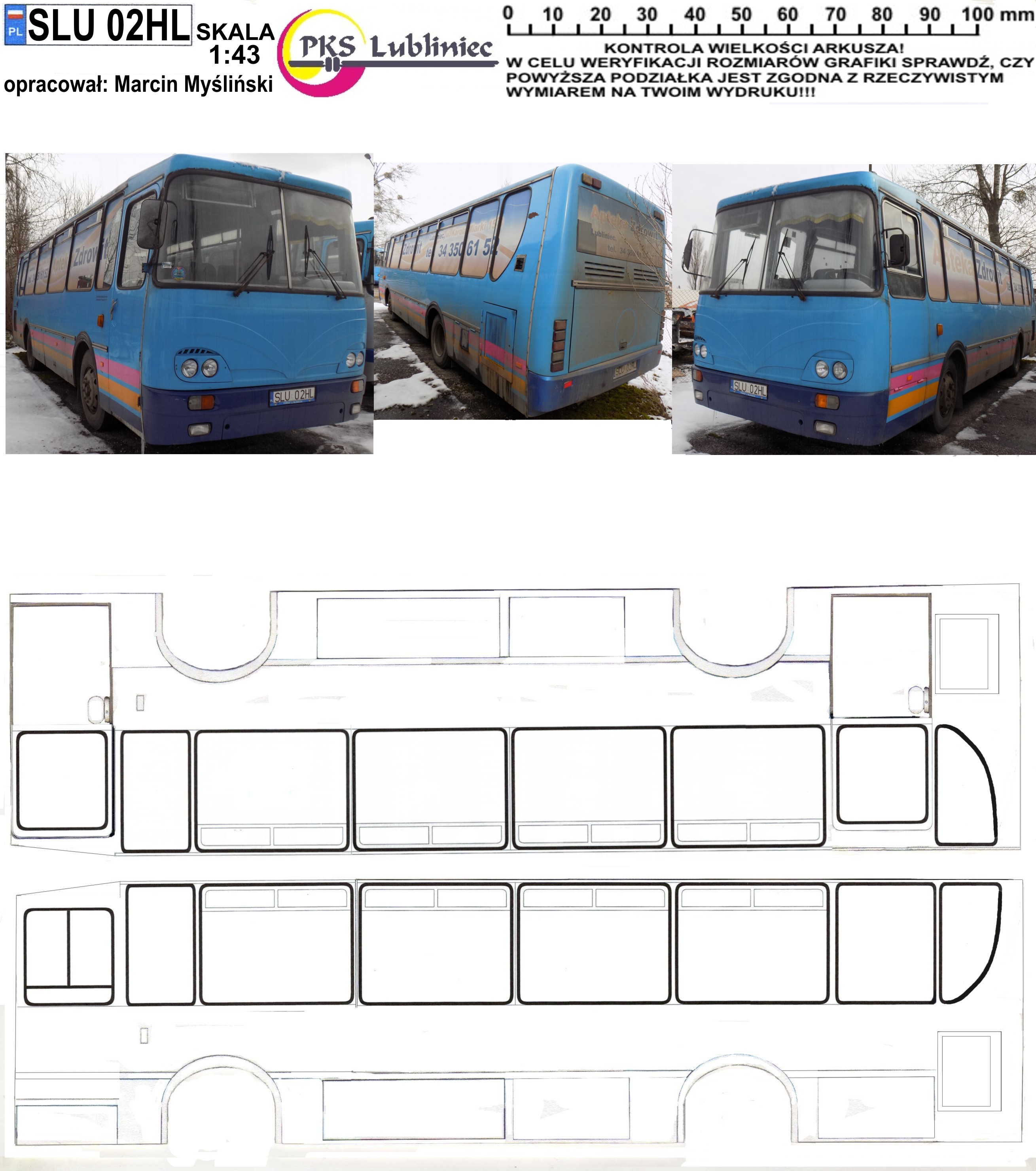 Bazą do zrobienia grafik była słynna już wycinanka wydawnictwa Answer z 2010 roku. Elementy ścian bocznych autobusu przeskalowałem do 1:43 i połączyłem oraz "wygumowałem" kolory, aby można było zrobić wydruk bardziej ekonomiczny (bo i tak później wszystko maluję i lakieruję Pactrą).