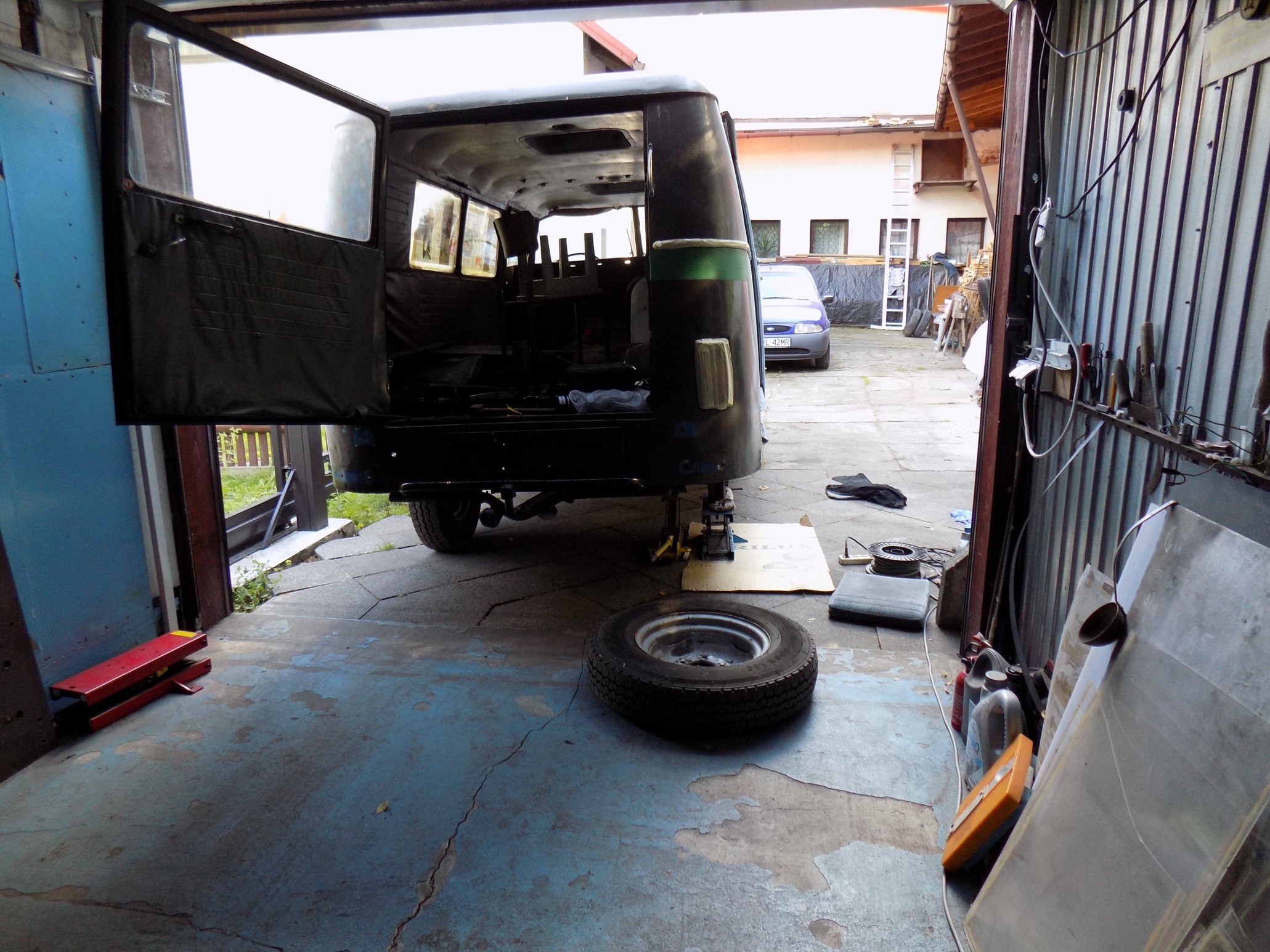 O ile Fiestę udało mi się bez żadnych "sensacji" przechylić o 60 stopni, o tyle w Nysie już przy 45 stopniach zaczął z silnika olej kapać, a choć konstrukcja podnośnika jest stabilna i solidna, to jednak wolałem nie ryzykować ewentualnego przekoszenia kompletnej karoserii Nyski (może odważę się tak zrobić z karoserią bez szyb, drzwi i silnika...). Nie wiedziałem też czego mogę się spodziewać po tej kratownicy podłogi (ale tu akurat miłe zaskoczenie, bo jest bardzo solidna). Poza tym Nysa leżąca na sztorc podwórka - i jak tu przejść? :lol: