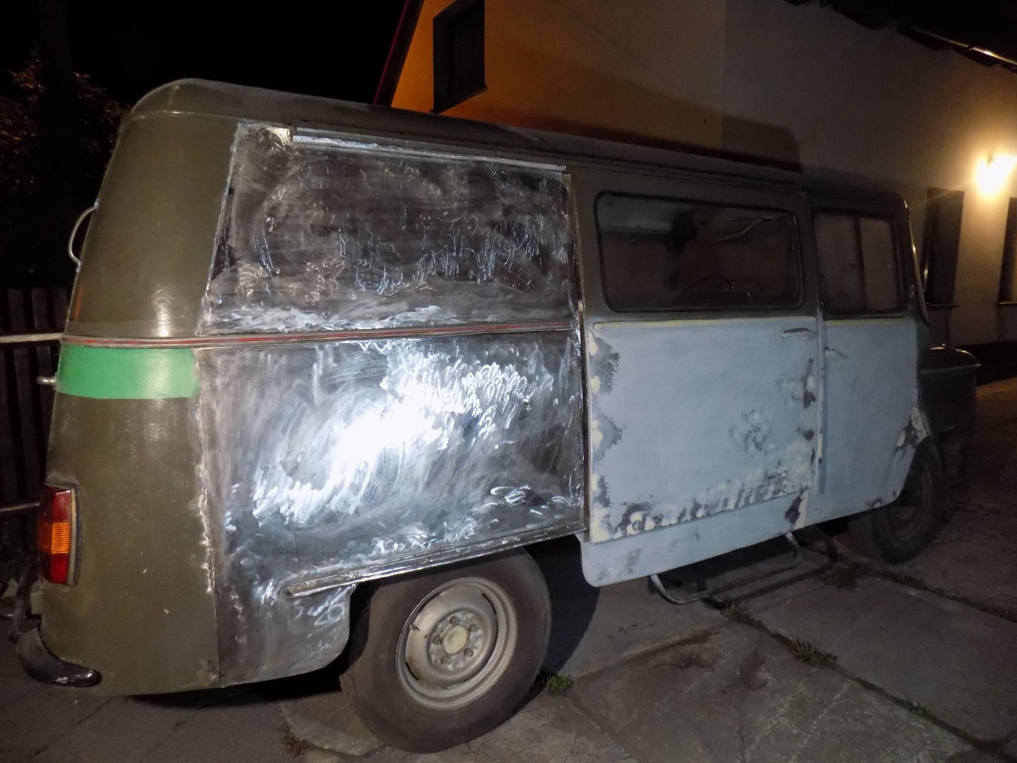 W drugi dzień mnie coś trafiło, bo musiałbym całą powierzchnię karoserii posmarować szpachlówką, żeby wypełnić wszystkie ubytki lakiernicze - powiedziałem więc: DOŚĆ - będę drzeć wszystko z zewnątrz do gołej blachy "jak leci" i malować wszystko podkładem epoksydowym na gołą blachę - tak, jak podwozie w moim Fordzie...