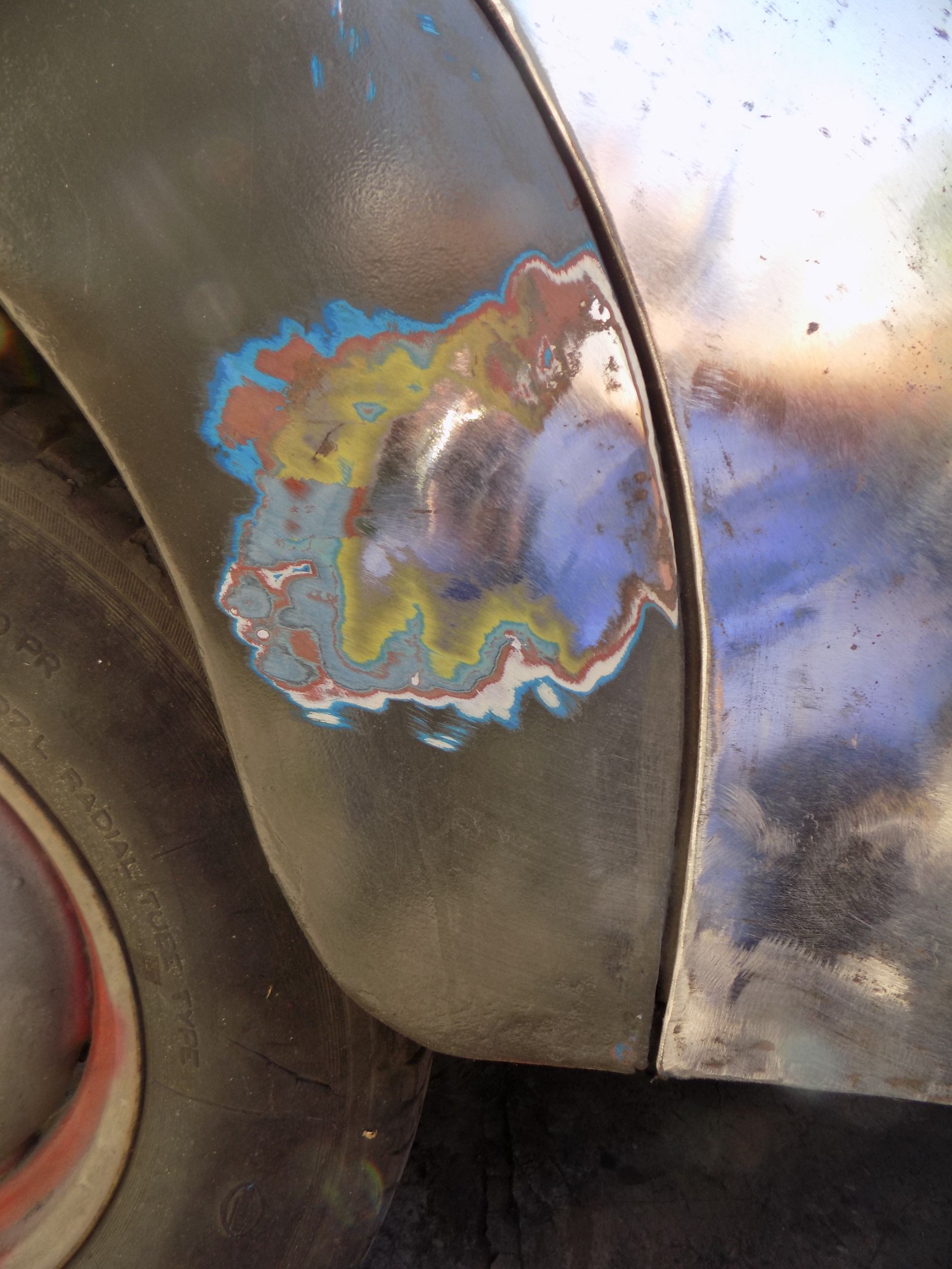 Wyciąłem pognite powierzchnie blach, resztę potraktowałem cortaninem, przeszlifowałem do gołej blachy, pomalowałem podkładem epoksydowym...