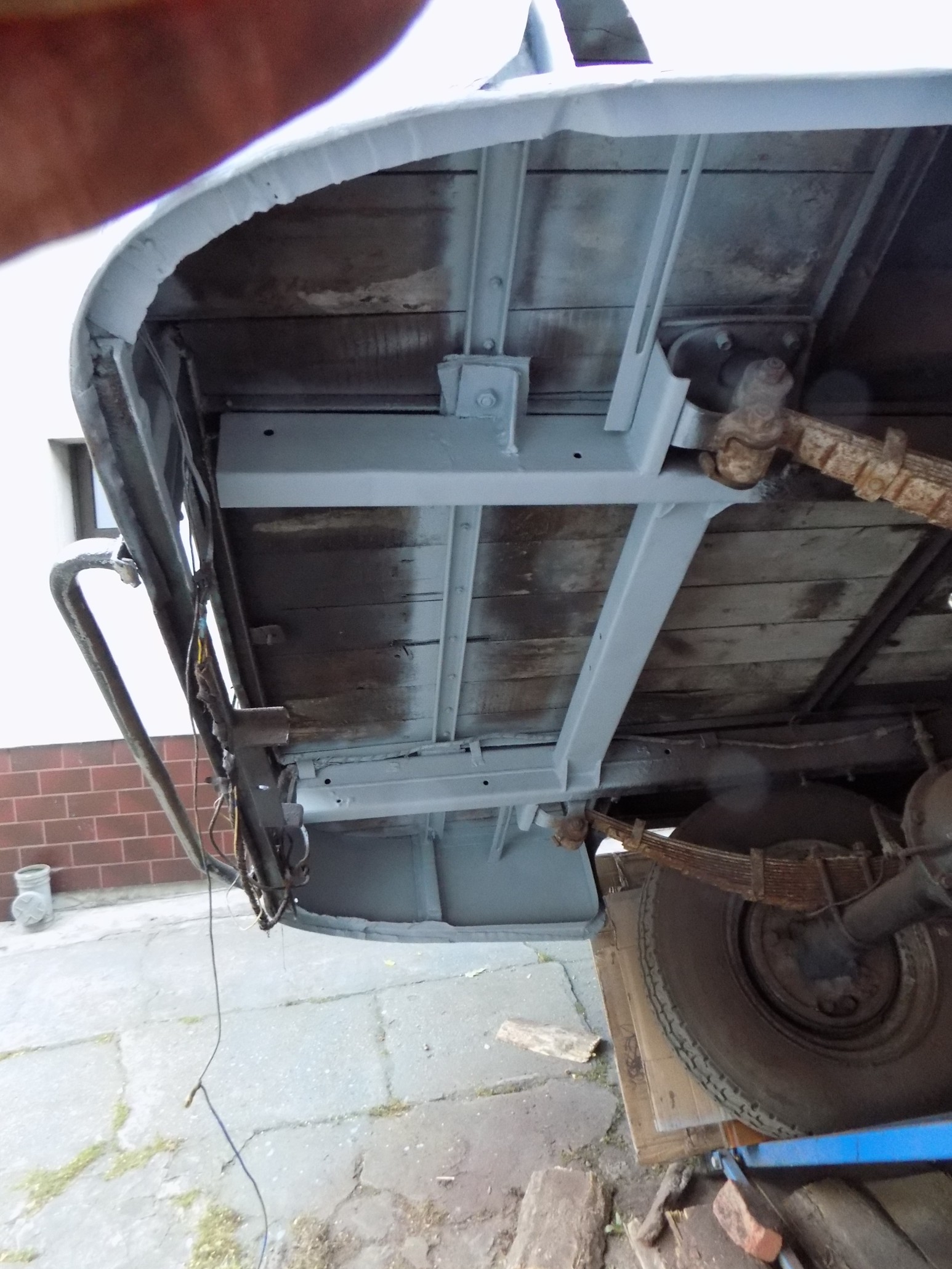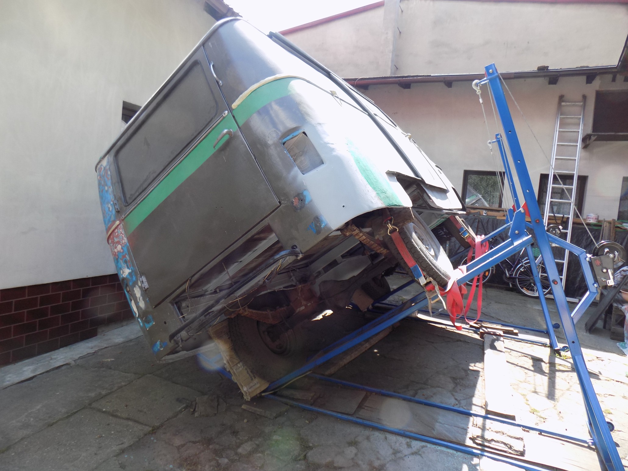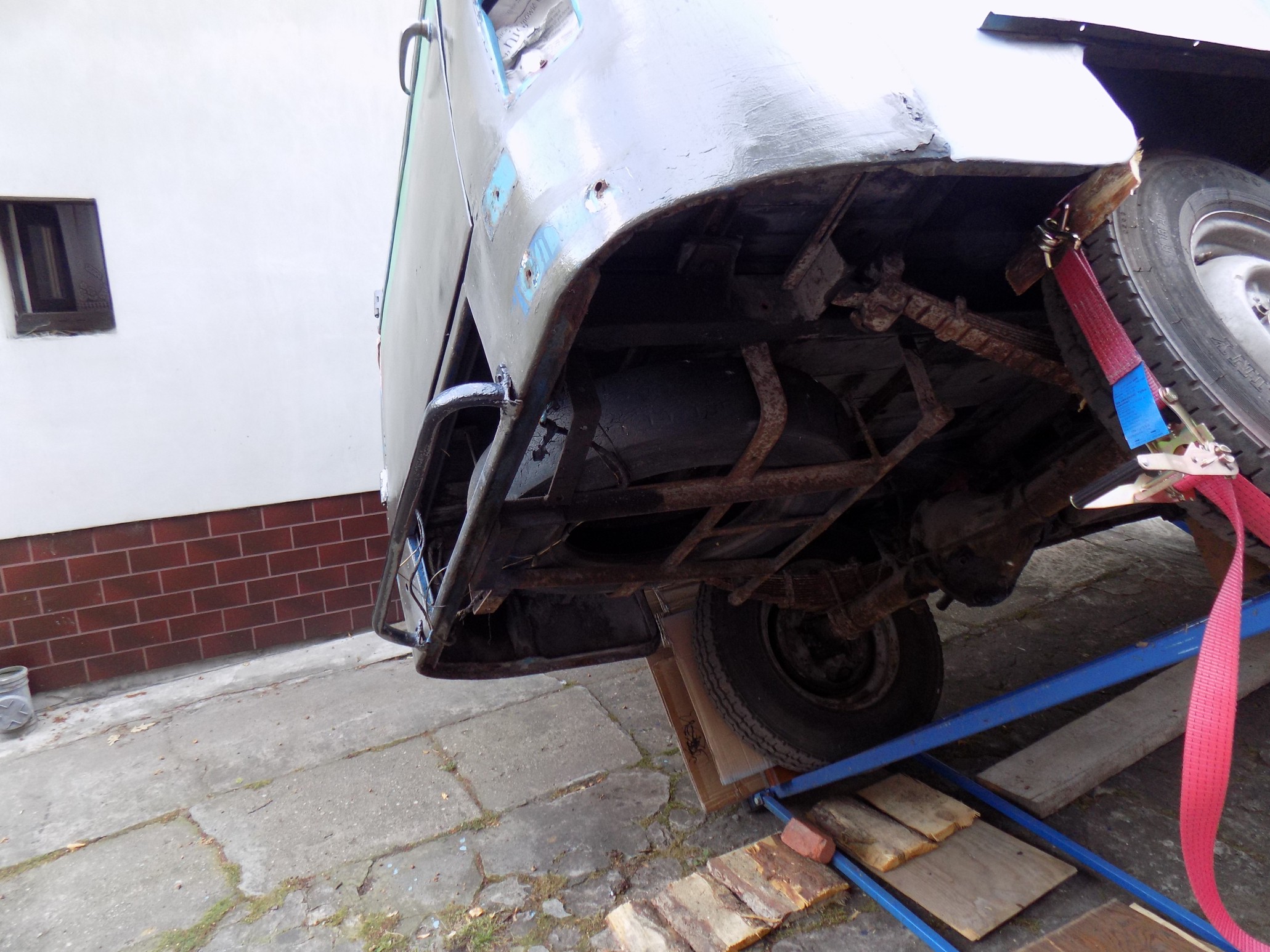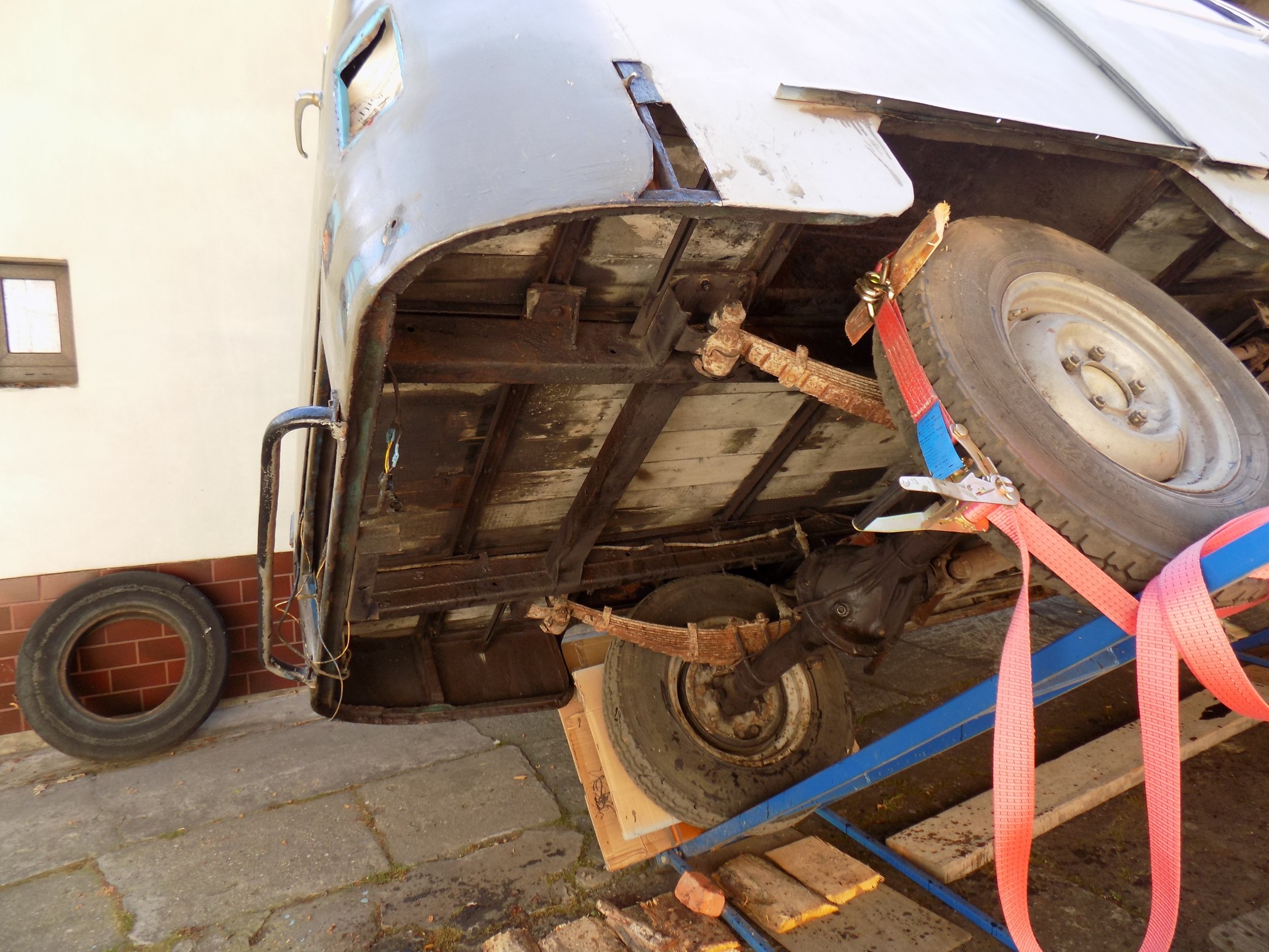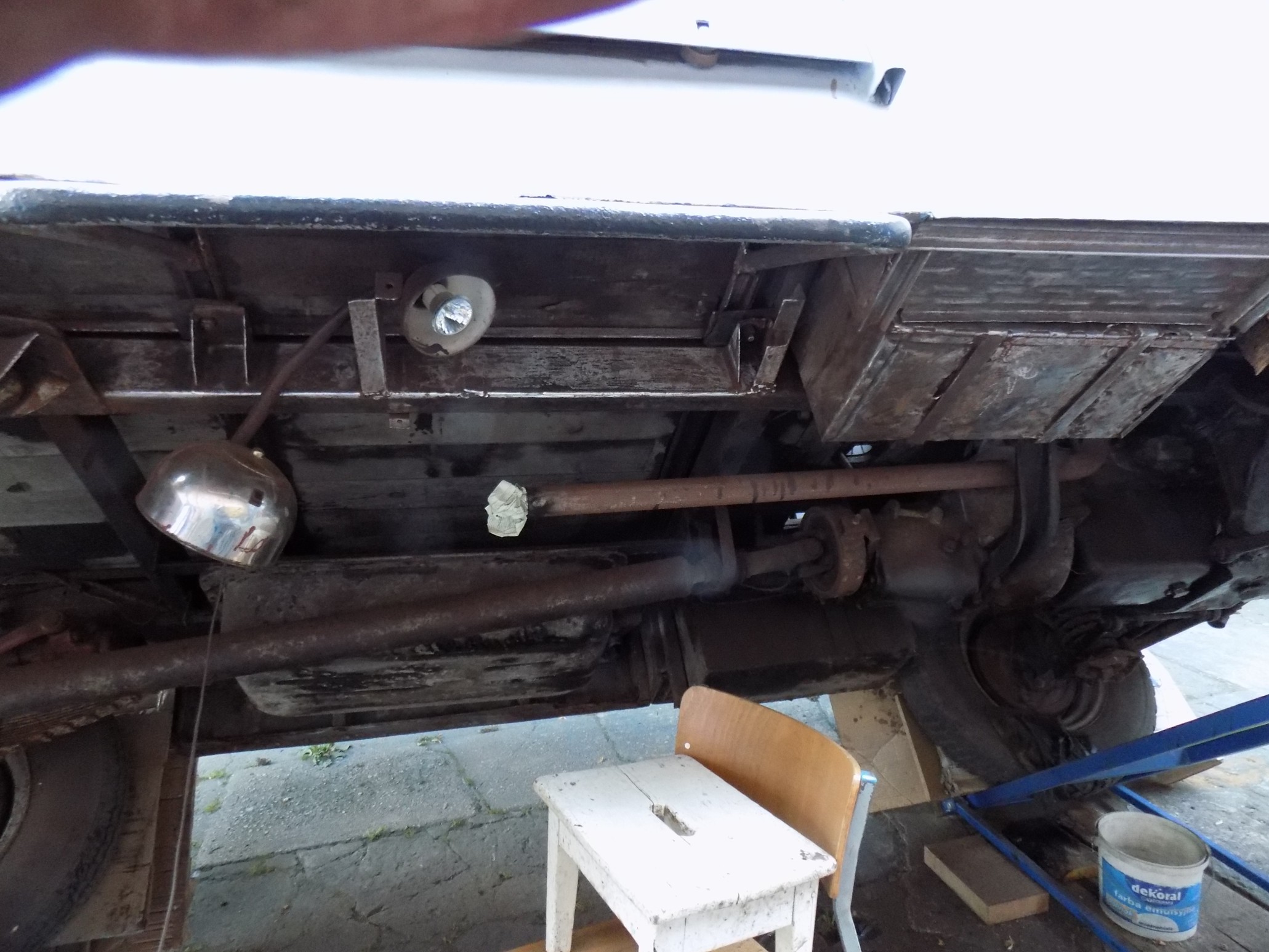 O ile Fiestę udało mi się bez żadnych "sensacji" przechylić o 60 stopni, o tyle w Nysie już przy 45 stopniach zaczął z silnika olej kapać, a choć konstrukcja podnośnika jest stabilna i solidna, to jednak wolałem nie ryzykować ewentualnego przekoszenia kompletnej karoserii Nyski (może odważę się tak zrobić z karoserią bez szyb, drzwi i silnika...). Nie wiedziałem też czego mogę się spodziewać po tej kratownicy podłogi (ale tu akurat miłe zaskoczenie, bo jest bardzo solidna). Poza tym Nysa leżąca na sztorc podwórka - i jak tu przejść? :lol: