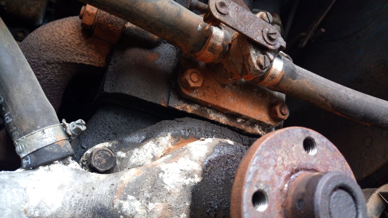 Wciąż i wciąż dolewałem wody do chłodnicy więc zacząłem szukać przyczyny. Tak na pierwszy rzut oka wydawało mi się, że to pompa wody jest obiektem wycieku. Po dostaniu się do niej okazało się, że to na pompę wody leje się woda z przepustnicy nagrzewnicy. Nic dziwnego skoro od kilku lat zalewania wodą zebrało się tyle kamienia i innego osadu, że oba ujścia były totalnie zatkane. Musiało to w końcu nie wytrzymać. Na szczęście mam jeszcze dawcę pod ręką to szybko poza pompą wody wymieniłem jeszcze przepustnicę, odczekałem aż silikon chwyci i zalałem całość płynem chłodniczym. Niech stracę. Całość na obecną chwilę (po jakiś czterech dniach) prezentuje się znośnie.