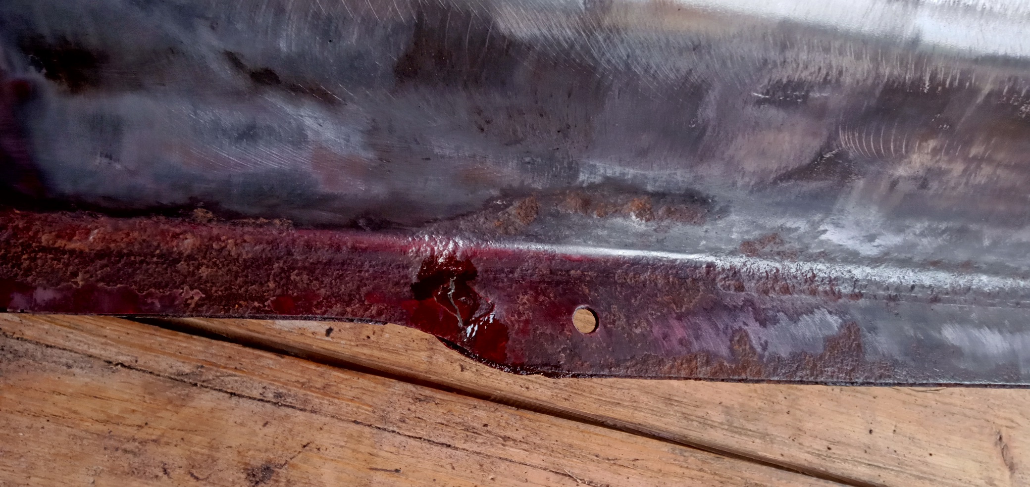 Wyczyściłem mechanicznie bak do gołej blachy. Do tej pory na tak czyszczone baki, najpierw szedł R-STOP, potem podkład epoksydowy i na to baranek "elastyczny". Jednak tym razem po kontrolnym nalaniu niewielkiej ilości benzyny stwierdziłem dwa niewielkie przecieki na zgrzewanej flanszy w miejscu gdzie korozja dokonała rozwarstwienia.