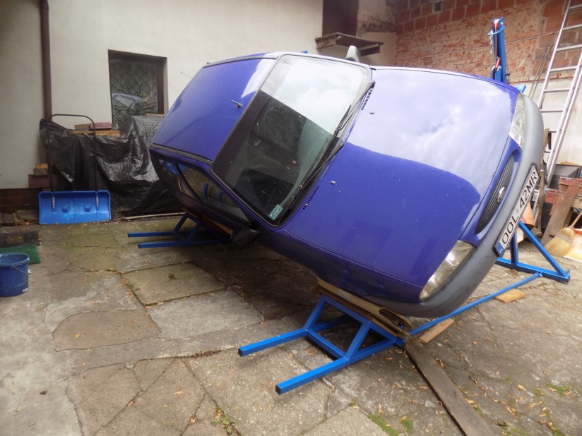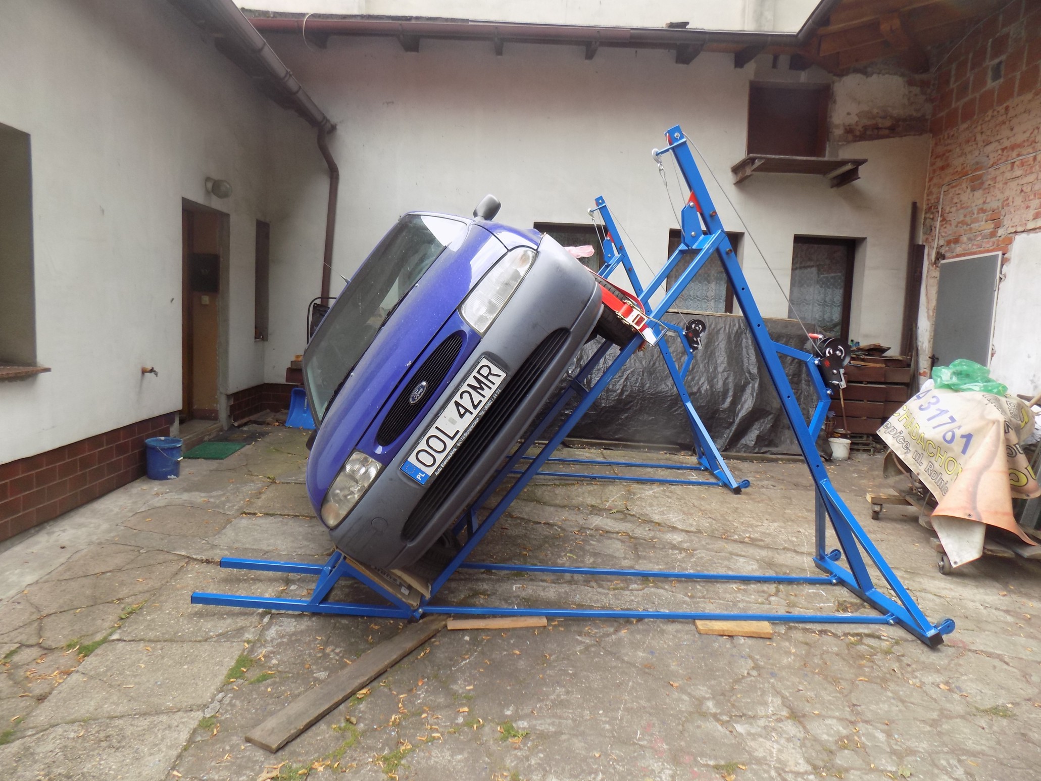 Komentarz: Auto mogę przechylać w sposób kontrolowany i bez ryzyka dachowania - dzięki wyciągarkom linowym (firmy DRAGON WINCH). Przechył pojazdu jest ograniczony do 60 stopni (dalszy przechył nie jest możliwy) dzięki czemu nie trzeba spuszczać oleju, paliwa ani wyjmować akumulatora z auta. Podczas prac przy aucie pojazd nie wisi na linach, ale na czerwonych stalowych zawleczkach, które się wkłada w maszty podnośnika
