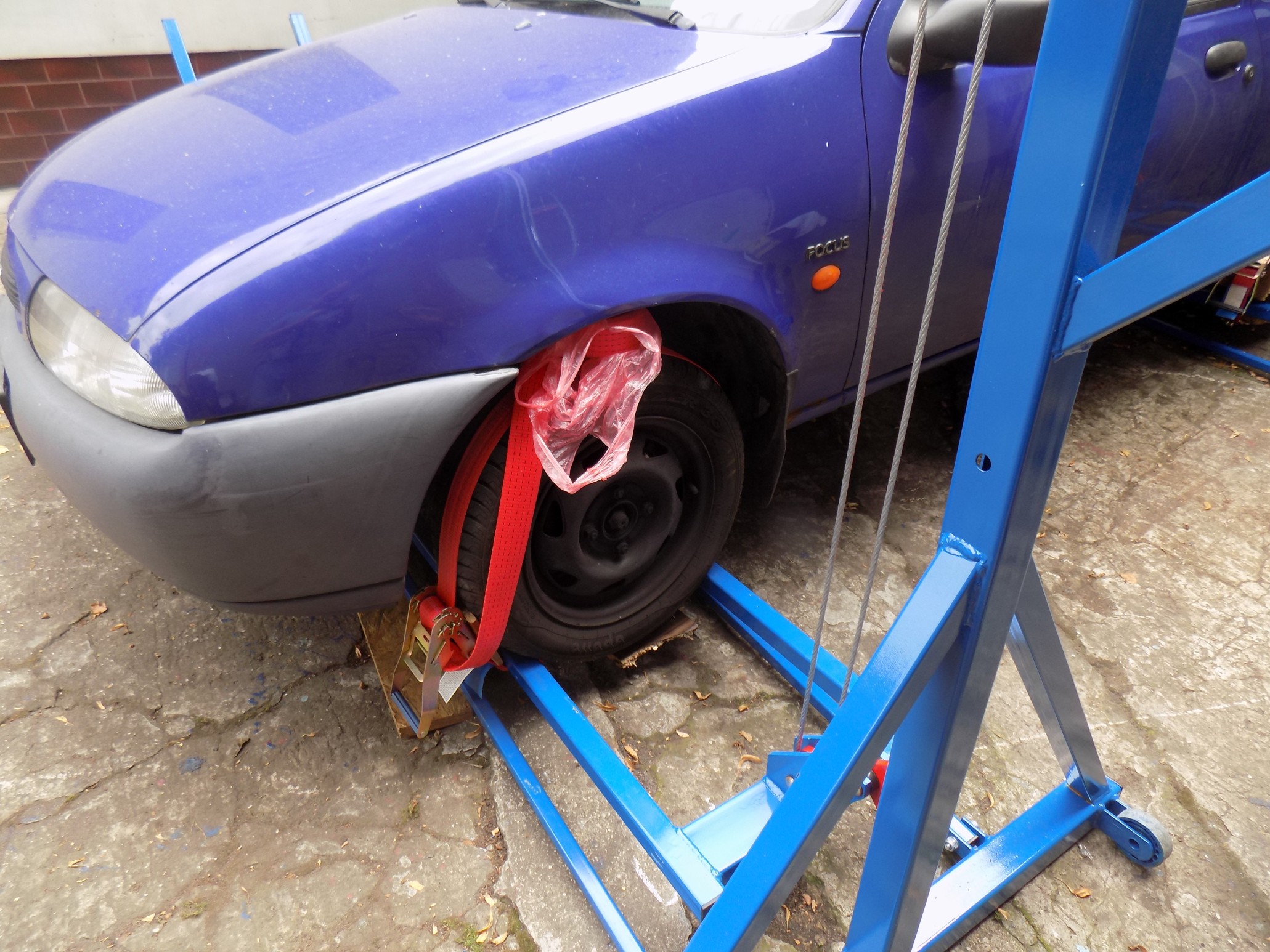 Komentarz: Koła znajdujące się od strony dźwiganej w górę lepiej przywiązać taśmami do transportu aut na lawetach do podnoszonej ramy "gondoli" - dzięki temu nie ma żadnego ryzyka, żeby podniesiony samochód się "odkleił" od podnośnika i "przeleciał" przez niego dachując