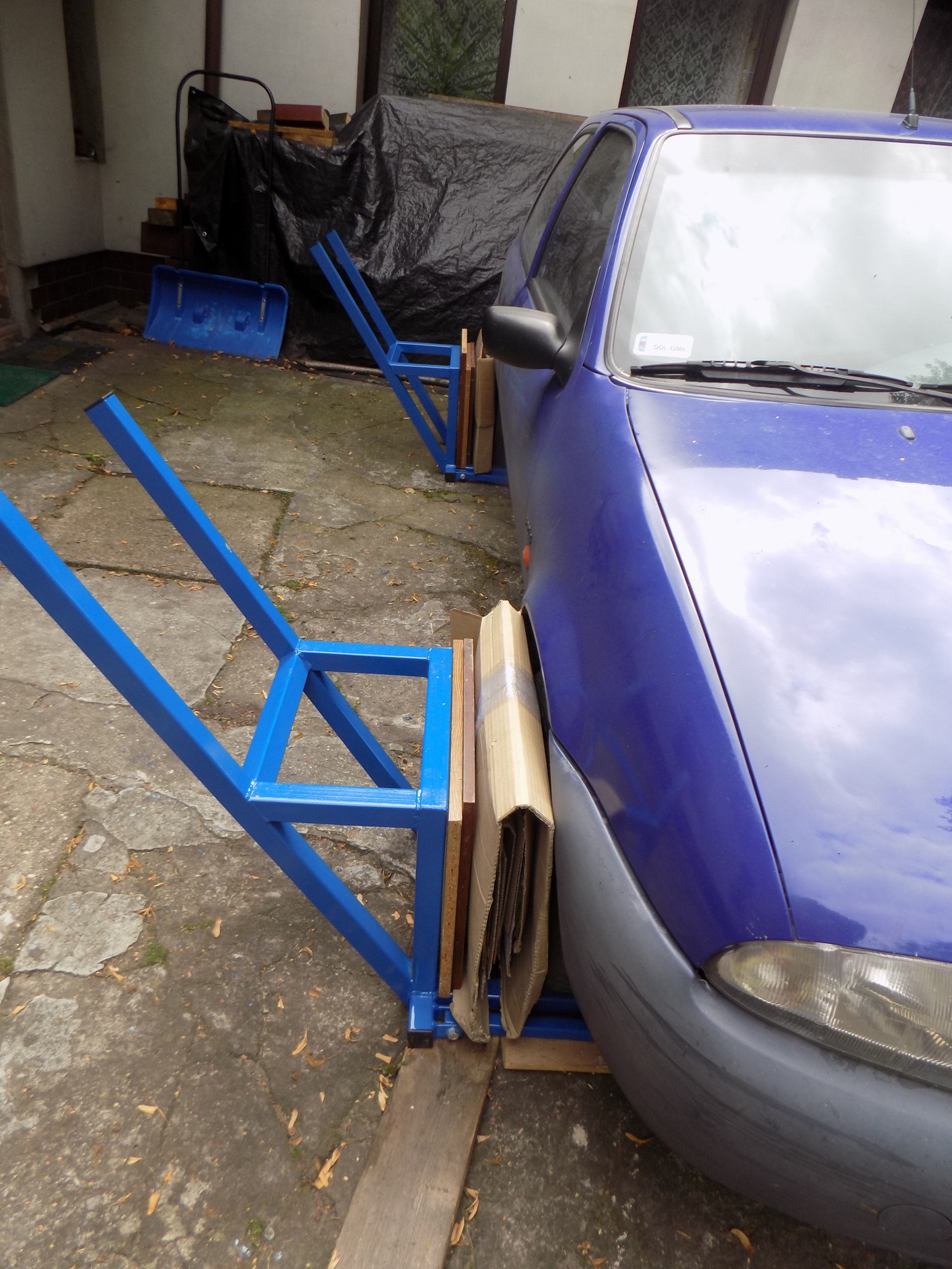 Komentarz: Po wjechaniu na podnośnik zawsze zostanie odstęp pomiędzy kołami auta, a konstrukcją na której się one oprą. W tą przestrzeń wkładałem w formie dystansów: kawałki płyt wiórowych oraz "poduszki" zrobione z dużej ilości tektury falistej owiniętej streczem - dzięki temu nie ma ryzyka porysowania felg, a samochód po podniesieniu nie przesunie się zbyt blisko podnośnika (co by stwarzało ryzyko porysowania boku podczas późniejszego zjeżdżania z podnośnika)