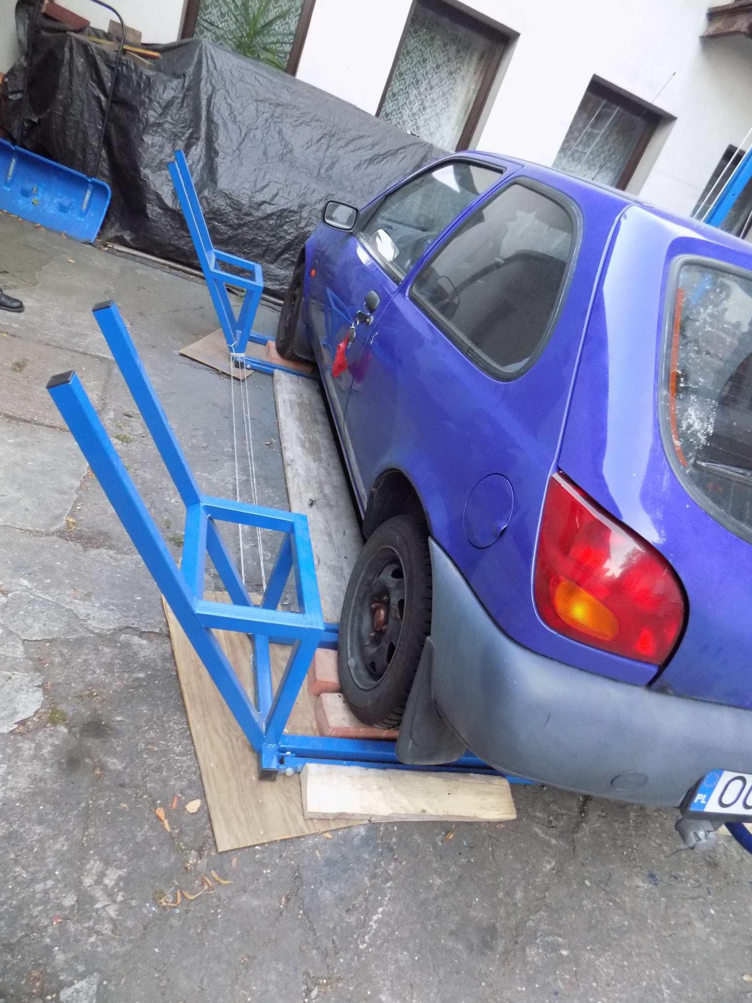 Komentarz: Wszystkie klocki, sznurki i cegłówki rozłożone wokół podnośników nie znalazły się tam przypadkiem - to już akurat mój pomysł. Chodzi o to, żeby auto podczas wjeżdżania na podnośnik nie "wpadało" kołami gwałtownie w otwory w których ma się docelowo znaleźć - bez tego wszystkiego miałem spory problem z wjeżdżaniem i wyjeżdżaniem z podnośnika. Auto nie tylko jedzie po belkach, ale i stwarzają one stabilny dystans między podnośnikami. Dzięki sznurkom, którym związałem ze sobą oba podnośniki - nie ma ryzyka, że się one rozsuną podczas wjazdu/wyjazdu auta i uderzą w bok pojazdu