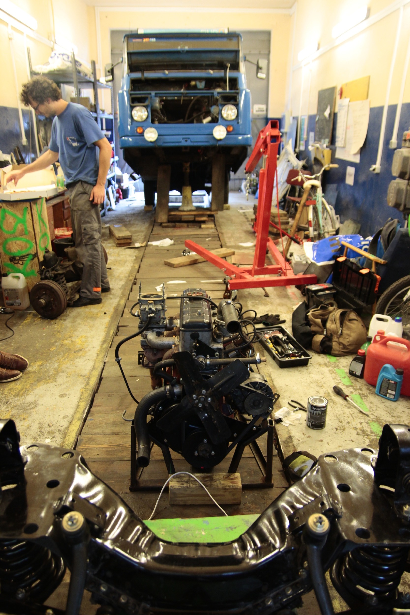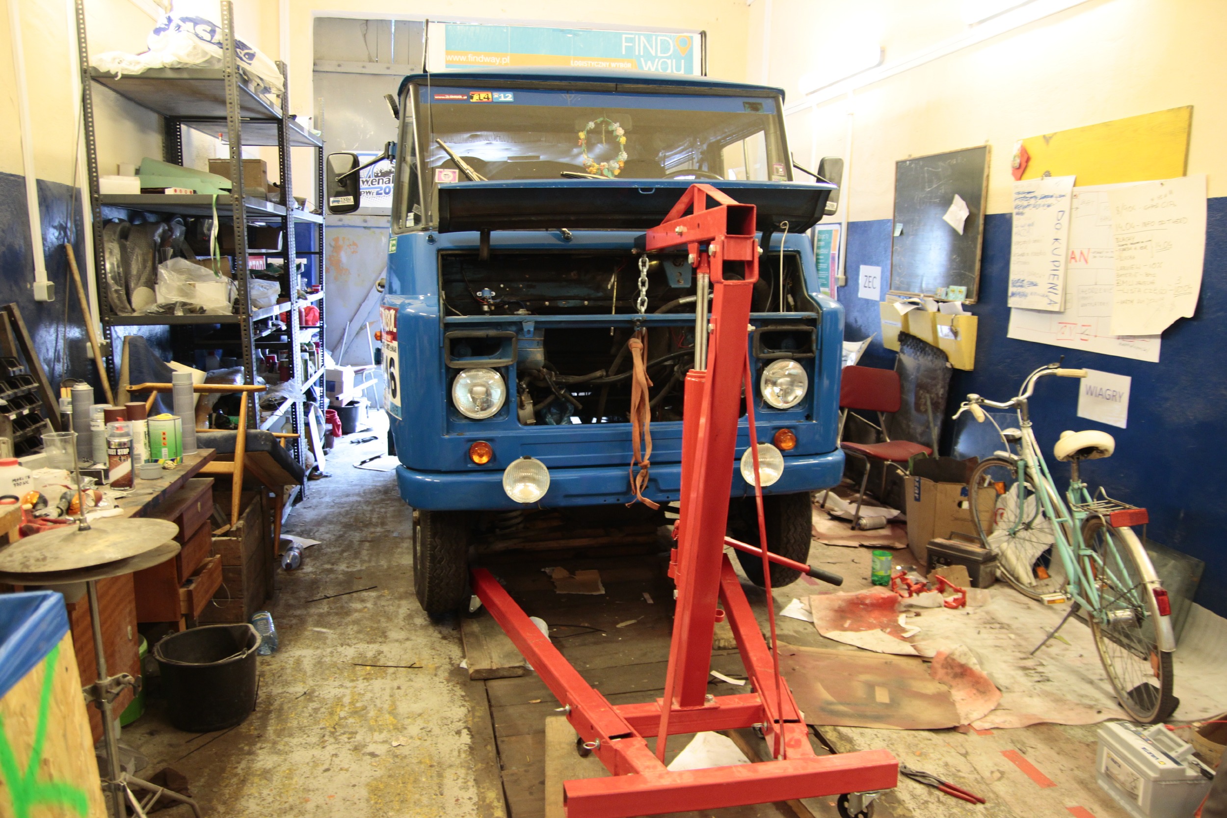 Procedura wyglądała tak, że podnośnikiem do silników podnieśliśmy przód budy(z ramą) na wysokość ok 1,20 m. Podparliśmy budę za ramę wielkim budowlanym filarem - naprawdę stabilny, te "prowizoryczne" deski po bokach są faktycznie prowizoryczne, miały zabezpieczać przed przewróceniem konstrukcję, która była w zasadzie nieprzewracalna. Ale kierując się zasadą "strzeżonego pan Bóg strzeże..." daliśmy te deski :D