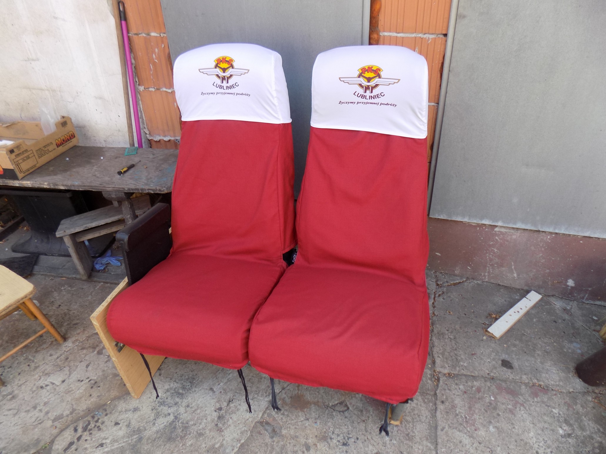 We flocie PKS Lubliniec najczęściej widziałem (i pamiętam) pokrowce w kolorze czerwonym (takie, jak na zdjęciach mojego siedzenia), ale na magazynie znalazłem pojedynczą sztukę pokrowca w kolorze szaroniebieskim i chyba szaroczerwonym (szary z nitkami/paskami w kolorze). Przygotowałem też siedzenia w barwach innych PKS-ów: Opolskie PKS, Zielona Góra i Kozienice.