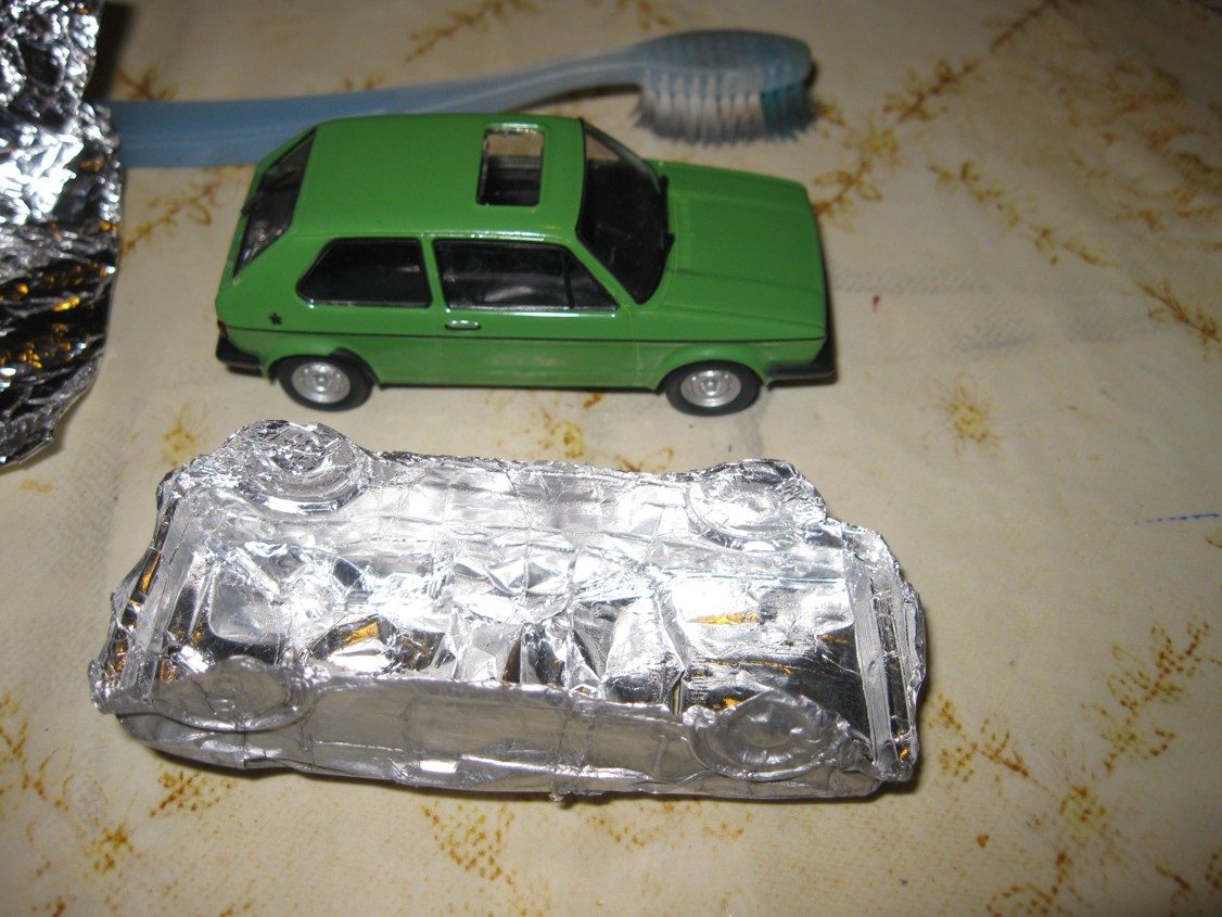 Nakładamy na niego folię aluminiową. Robimy to ostrożnie, aby nie rozedrzeć folii, ale jednocześnie odbić w niej wszystkie jakie tylko się da detale: zarysy drzwi i maski, kształty okien, kratki wlotu powietrza, reflektory, zderzaki itp itd. Najlepiej zaczynać od dachu i przechodzić kawałek po kawałku w dół od słupków dachowych poprzez maskę, ściany boczne, po zderzaki i krawędź dolna karoserii. Najlepiej najpierw dociskać folię opuszkami palców, a po dokładniejszym naciągnięciu folii na model "pogłaskać" folię starą szczoteczką do zębów - aby odbiły się takie detale, jak zarys reflektorów czy kratki wlotu powietrza. Za pierwszym razem może się to Wam rozedrzeć tu i ówdzie, ale z czasem nabiera się wprawy i wcale to nie jest już takie trudne