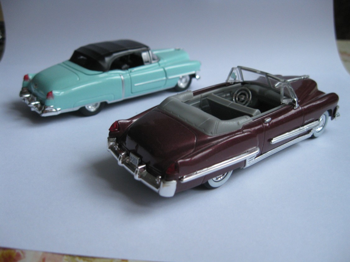 ... bardzo podobny (bo przedstawiciel tej serii, ale w innej wersji nadwozia) Cadillac wjechał na teren więzienia Sing-Sing w USA w dniu 19 czerwca 1953 roku, zabierając zwłoki małżeństwa Juliusa i Ethel Rosenbergów i kończąc tym samym ostatni akt chyba jednej z największych afer szpiegowskich w historii USA... Próbowałem znaleźć te kadry filmowe z "Sensacji XX wieku", gdzie widać tego Cadillaca, ale nie znalazłem Prawdopodobnie był to ten model: Cadillac Landau Hearse (1953) ![]() ![]() ![]() ![]() ...tymczasem mój pistacjowy Cadillac Eldorado aż się prosił na małe porównanie z jego "starszym bratem" - to jest Cadillac Coupe Deville (1949) z serii "Legendarne samochody" z Amercomu. Oba auta są do siebie wręcz uderzająco podobne Zestawienie tego Welly z tym z Amercomu nie pozostawia wątpliwości - oba auta są w tej samej skali 1:43 i na opakowaniach Welly mogą sobie pisać, co chcą - wymiary nie kłamią!