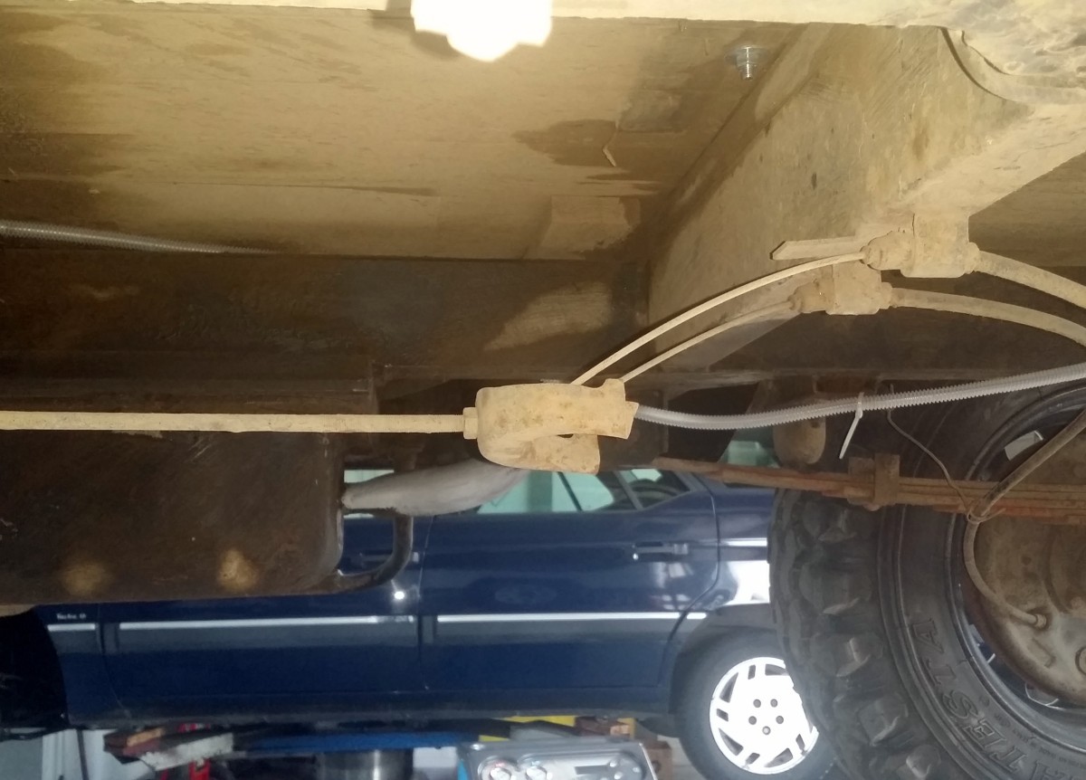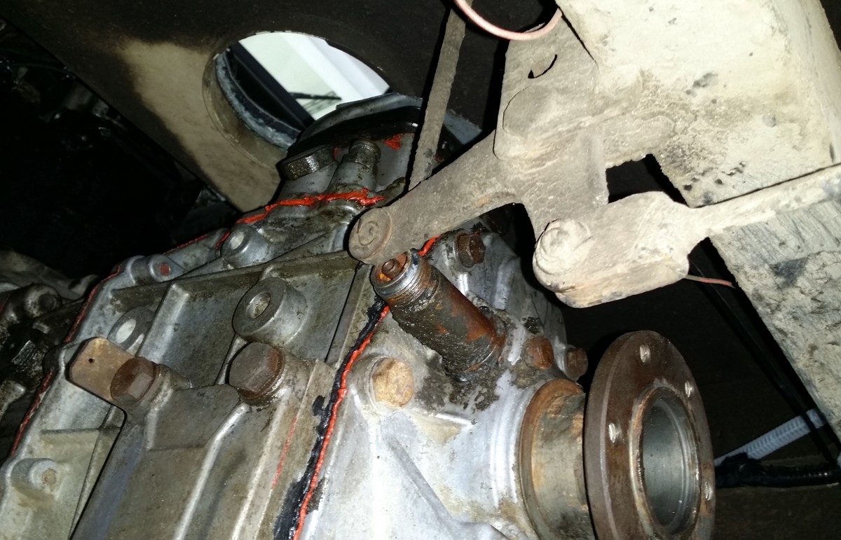 Na drugiej fotce widzicie już wstawioną skrzynię. Są jeszcze dwie pułapki które trzeba uwzględnić. Pierwsza to hamulec ręczny - idealnie przeszkadza wyjściu linki prędkościomierza. Trzeba obciąć jego wspornik i przenieść ciut obok i wspawać go od dołu, a do tego odwrotnie: