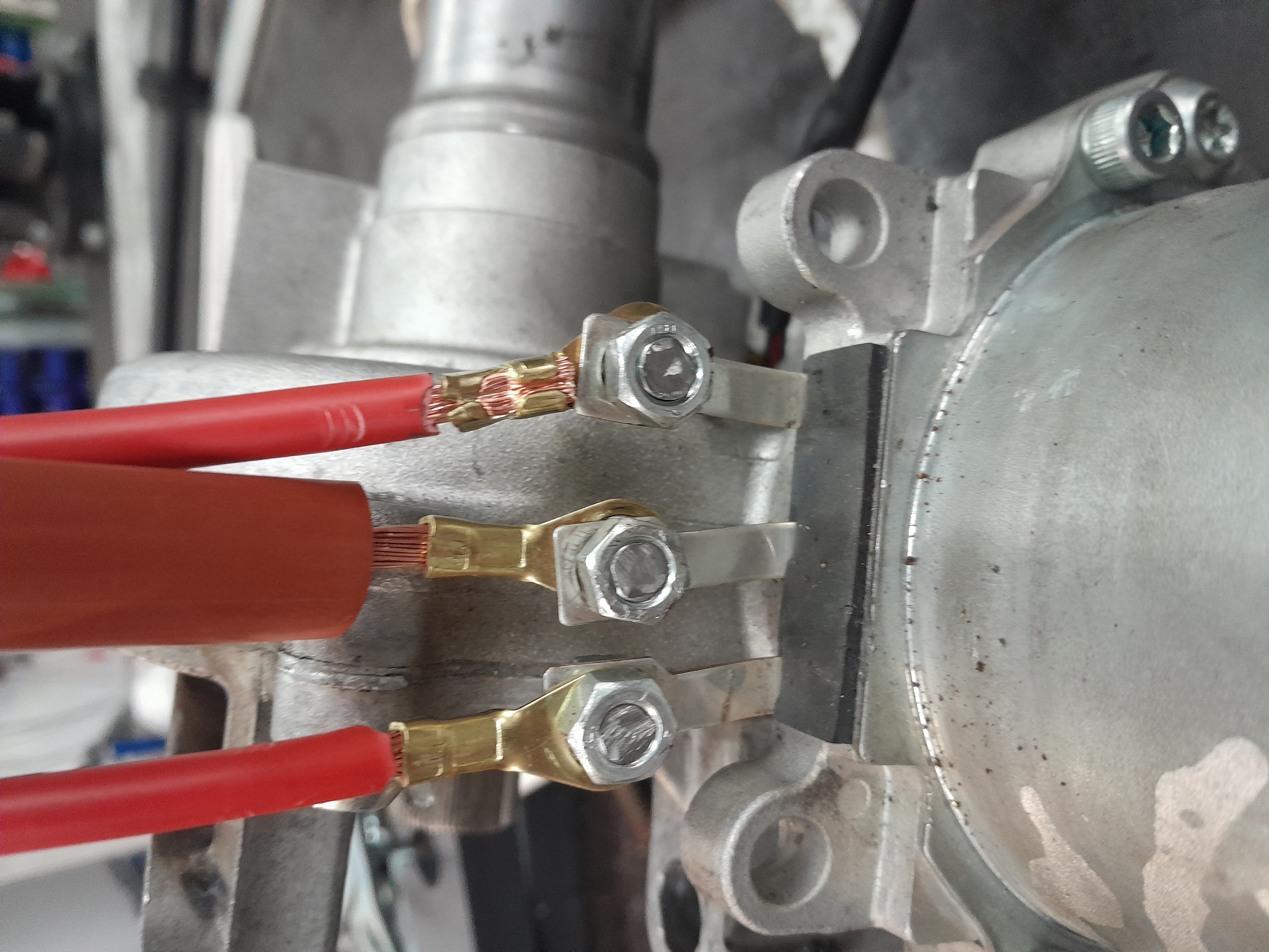 3 przewody dlugosci ok 10cm zasilające silnik otrzymały oczka i zostały przykrecone za pomocą przycietyfch na wysokość 1 nakretki srub m6