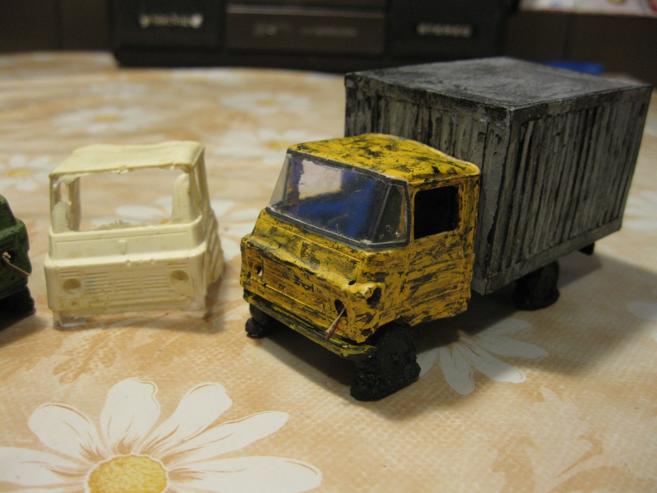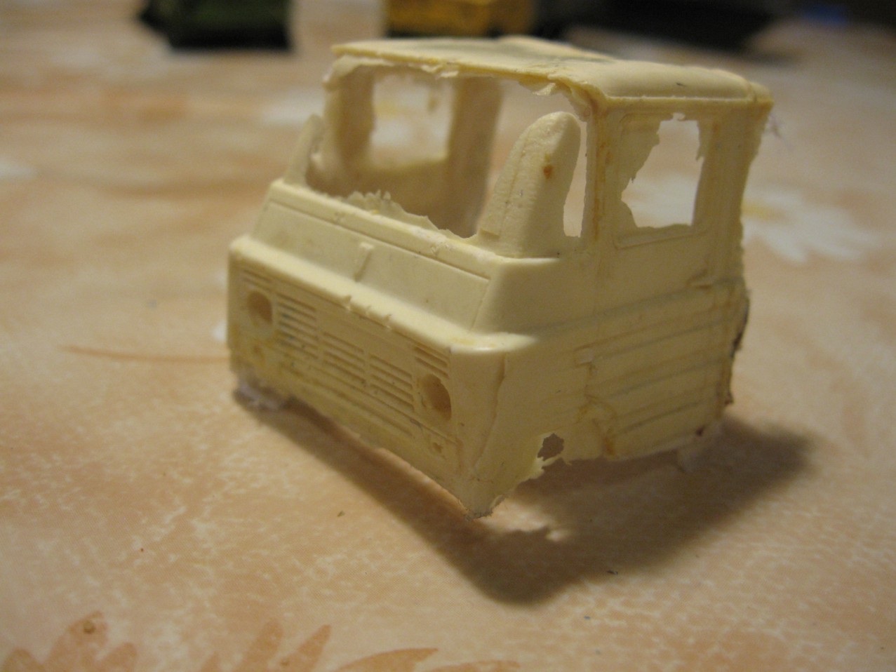 Odlałem kilka próbnych sztuk. Matryca nie była doskonała. Niebawem bodaj w styczniu 2012 roku, dowiedziałem się, że DeA planuje wydać tego niebieskiego A 11B więc prace zarzuciłem, ale modele ukończyłem. Wady matrycy okazały się paradoksalnie zaletą. O ile ciężko by z niej odlewać modele kabin dla dobrych, sprawnych ciężarówek, o tyle do odlewania kabin wraków - po stłuczce, przegnitych itd są idealne :mrgreen:
