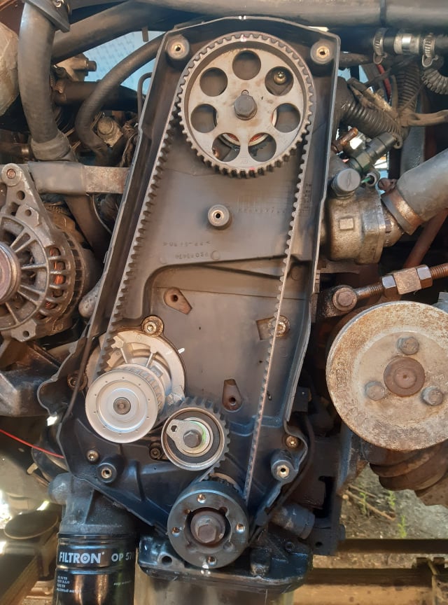 Dobrze, rozrząd wymieniony, choć z przygodami bo gad ma dzielone koło pasowe i trzeba je pierw wykręcić teraz wiem. A srube w wale potem. Ogólnie to znak jest na kole zębatym na wale i na dole na obudowie miski. Takie dwie podkówki. Znalazłem to dopiero na forum w Australii. Znaki opisane w instrukcji nie istnieją u mnie a znak na obudowie wewnętrznej rozrządu tylko wprowadza w błąd. Znaki na górze są standardowo na kole rozrządu i tylnej obudowie rozrządu. Ogólnie silnik odpalił i chodzi elegancko. Mam tylko wątpliwość czy w dobra stronę kręciłem napinaczem. Kręciłem w prawo, ale da się i w lewo? Ktoś wie jak jest prawidłowo?
